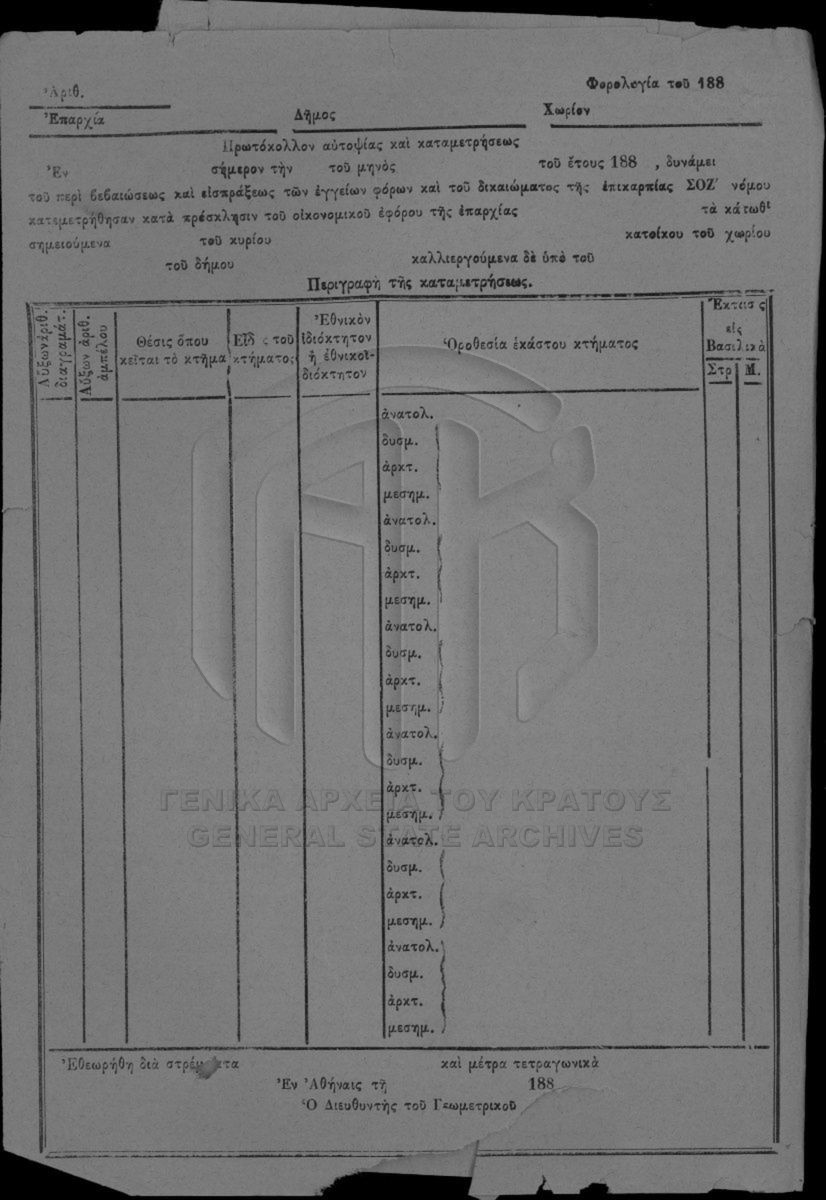 [Fonds] GRGSA-CSA_PAO005.01 ARCHIVES DE LA CHANCELLERIE/DU MINISTERE DES FINANCES : FERMES NATIONALES (1833-1869) - ARCHIVES DE LA CHANCELLERIE/DU MINISTERE DES FINANCES : FERMES NATIONALES (1833-1869) [1833 - 1869] Το αρχειακό σύνολο «Εθνικά Κτήματα» αποτελεί τμήμα του αρχείου της Κεντρικής Υπηρεσίας του Υπουργείου Οικονομικών και περιλαμβάνει τεκμήρ... |