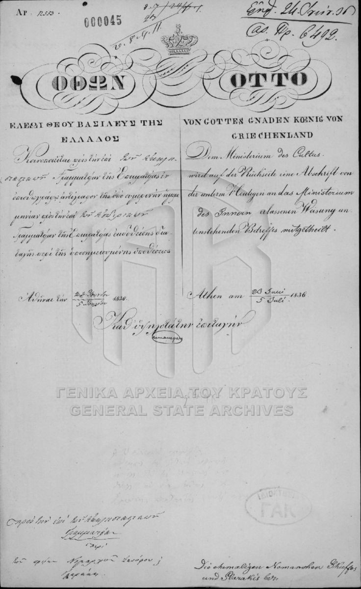 [Fonds] GRGSA-CSA_PAO013 ARCHIVES DE LA CHANCELLERIE/DU MINISTERE DES CULTES ET DE L'EDUCATION PUBLIQUE (1833-1848) - ARCHIVES DE LA CHANCELLERIE/DU MINISTERE DES CULTES ET DE L'EDUCATION PUBLIQUE (1833-1848) [1833 - 1848] Το αρχείο της Γραμματείας επί των Εκκλησιαστικών και της Δημοσίου Εκπαιδεύσεως διαρθρώνεται σε τρεις σειρές ως εξής: Ι. Σειρά των Εκκλη... |