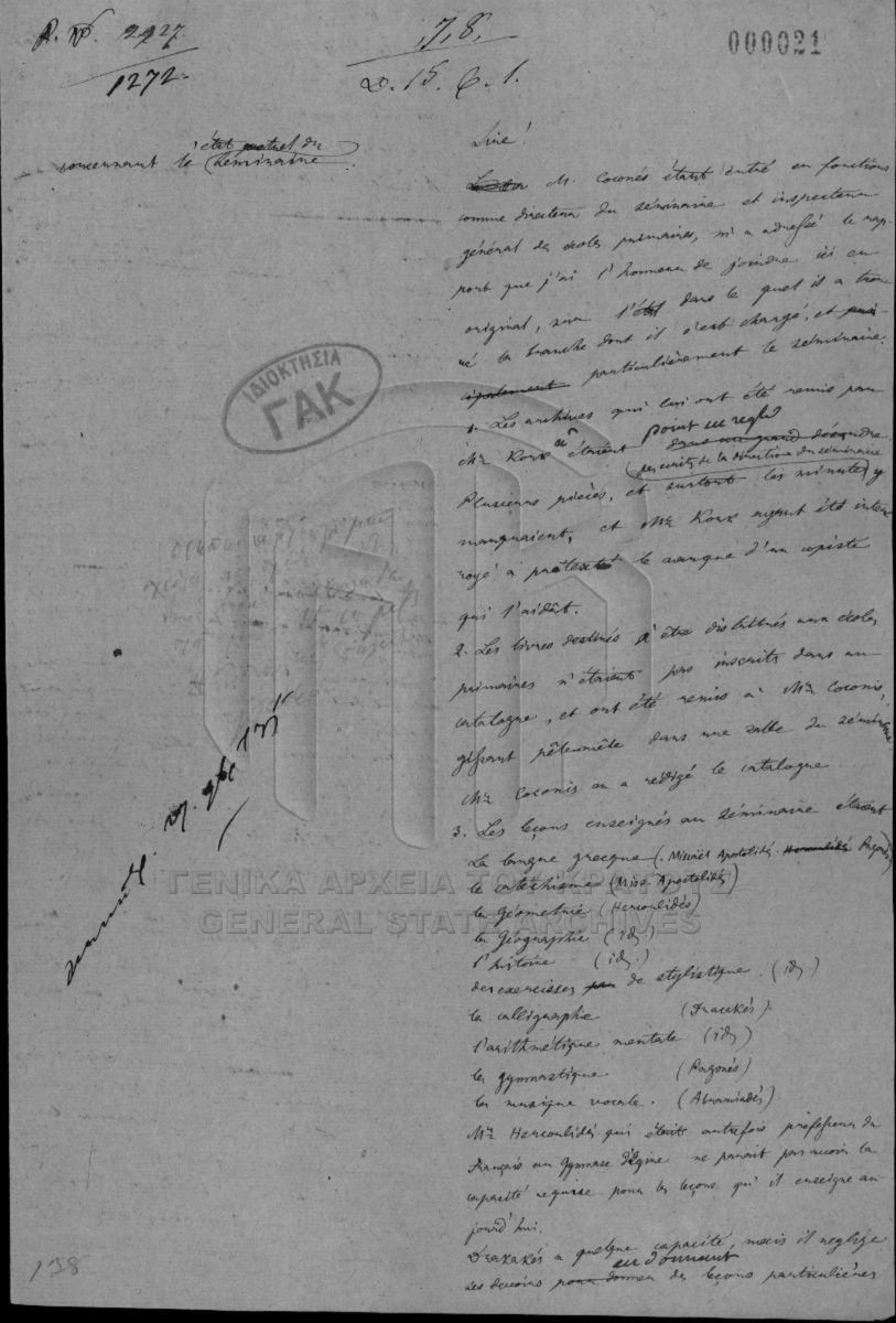 [Fonds] GRGSA-CSA_PAO013 ARCHIVES DE LA CHANCELLERIE/DU MINISTERE DES CULTES ET DE L'EDUCATION PUBLIQUE (1833-1848) - ARCHIVES DE LA CHANCELLERIE/DU MINISTERE DES CULTES ET DE L'EDUCATION PUBLIQUE (1833-1848) [1833 - 1848] Το αρχείο της Γραμματείας επί των Εκκλησιαστικών και της Δημοσίου Εκπαιδεύσεως διαρθρώνεται σε τρεις σειρές ως εξής: Ι. Σειρά των Εκκλη... |