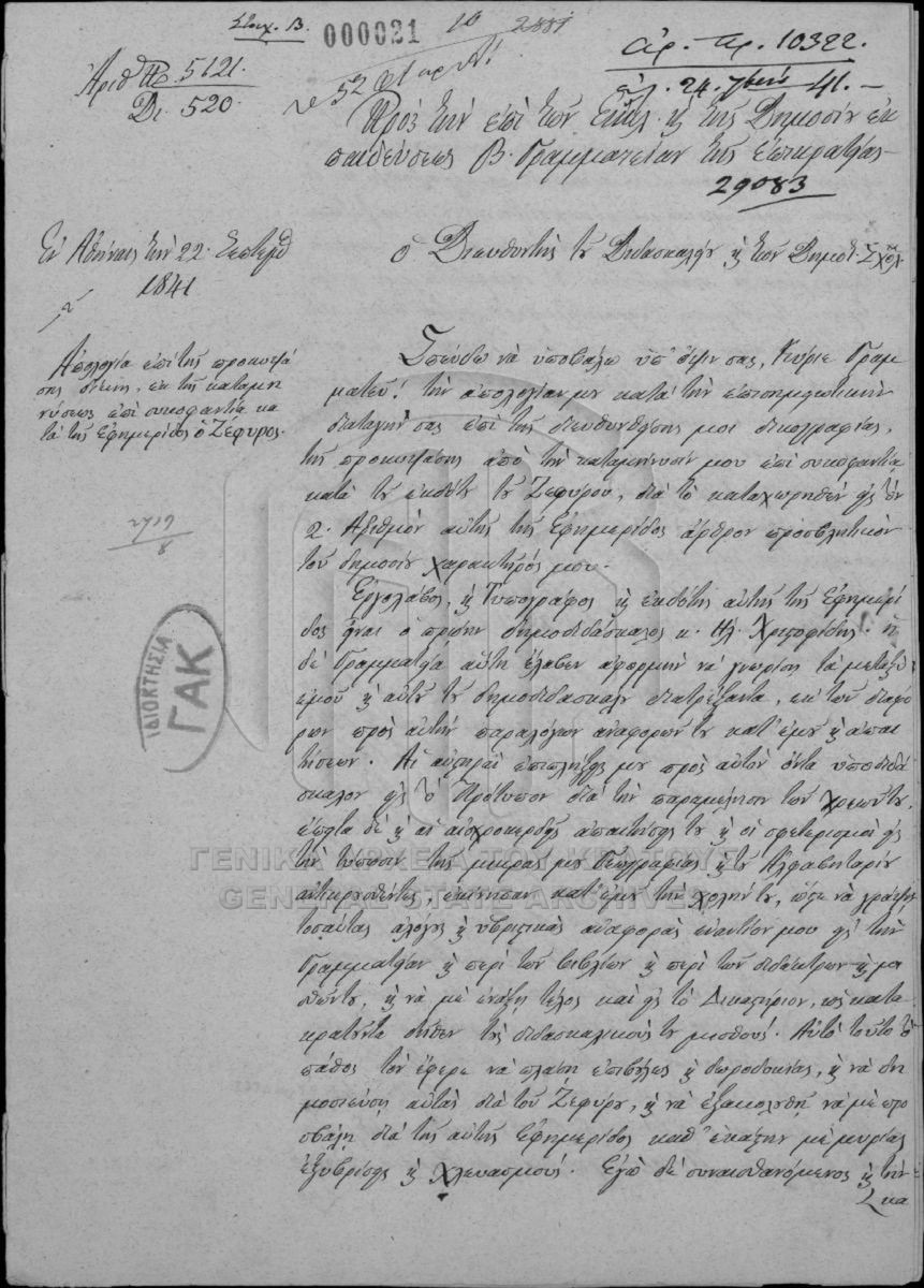 [Fonds] GRGSA-CSA_PAO013 SECRETARIAT/MINISTRY OF ECCLESIASTICAL ISSUES AND STATE EDUCATION ARCHIVE (1833-1848) - SECRETARIAT/MINISTRY OF ECCLESIASTICAL ISSUES AND STATE EDUCATION ARCHIVE (1833-1848) [1833 - 1848] Το αρχείο της Γραμματείας επί των Εκκλησιαστικών και της Δημοσίου Εκπαιδεύσεως διαρθρώνεται σε τρεις σειρές ως εξής: Ι. Σειρά των Εκκλη... |