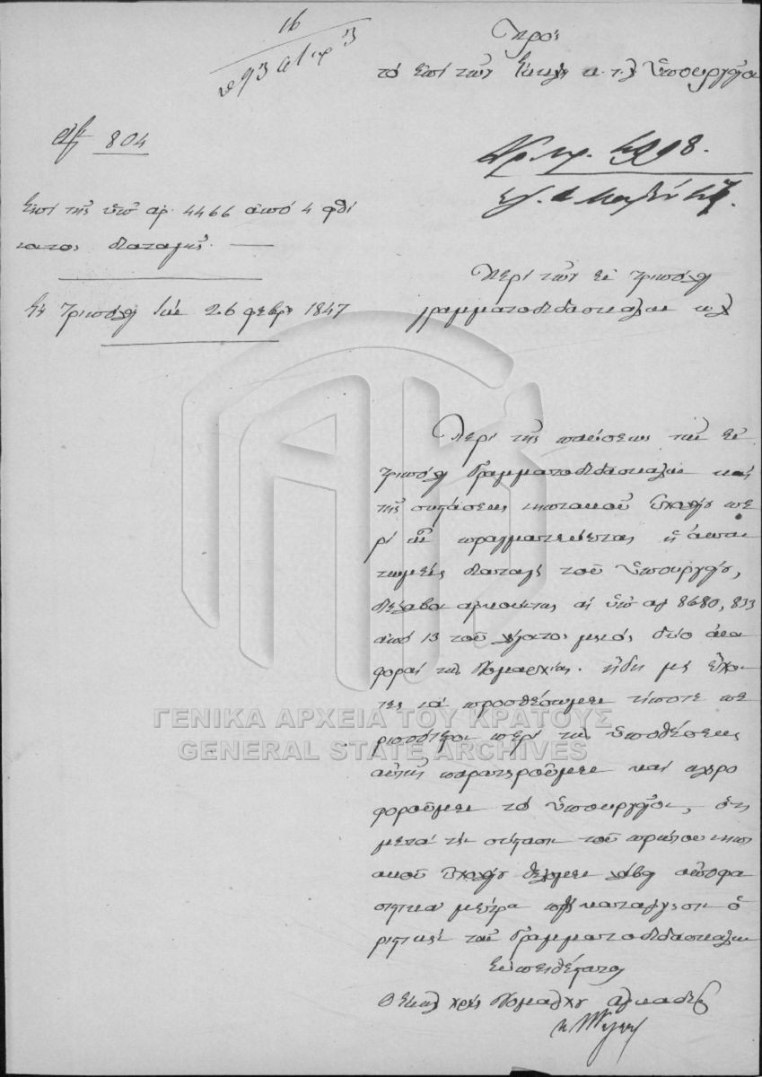 [Fonds] GRGSA-CSA_PAO013 SECRETARIAT/MINISTRY OF ECCLESIASTICAL ISSUES AND STATE EDUCATION ARCHIVE (1833-1848) - SECRETARIAT/MINISTRY OF ECCLESIASTICAL ISSUES AND STATE EDUCATION ARCHIVE (1833-1848) [1833 - 1848] Το αρχείο της Γραμματείας επί των Εκκλησιαστικών και της Δημοσίου Εκπαιδεύσεως διαρθρώνεται σε τρεις σειρές ως εξής: Ι. Σειρά των Εκκλη... |