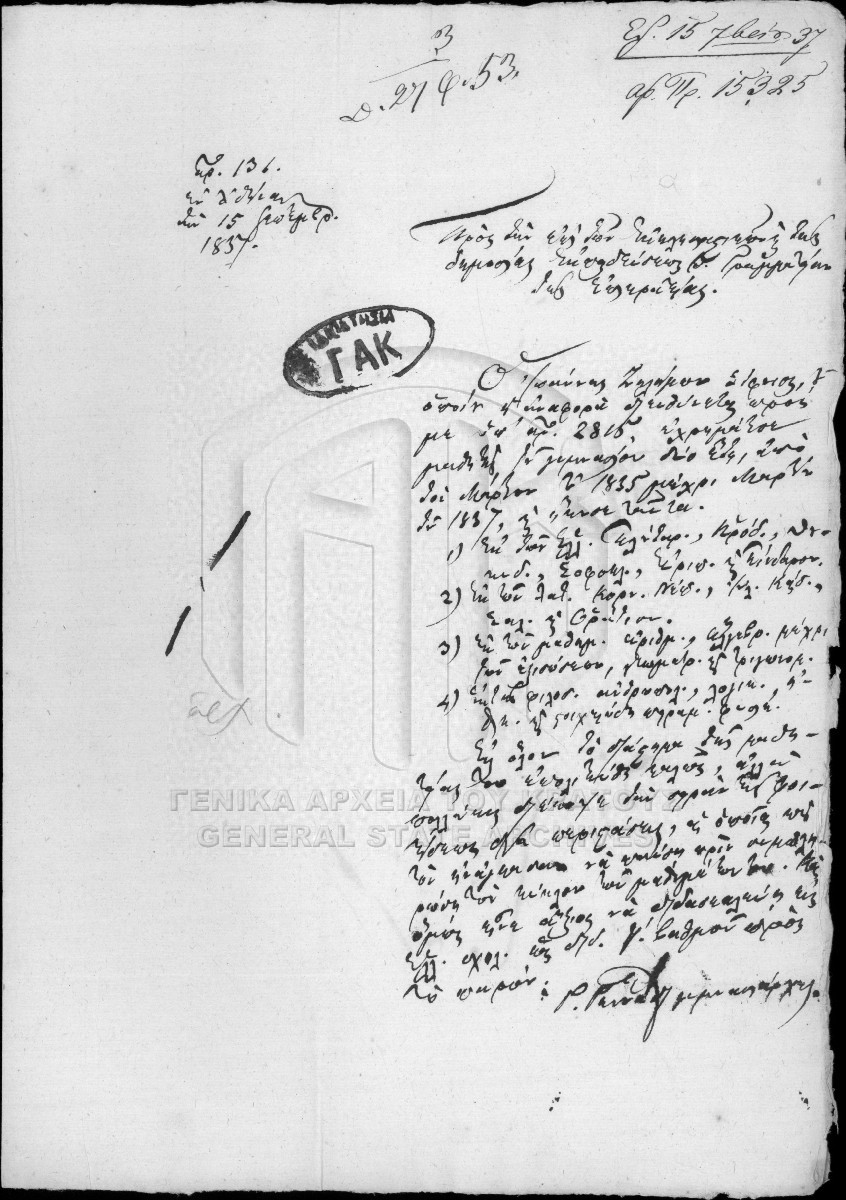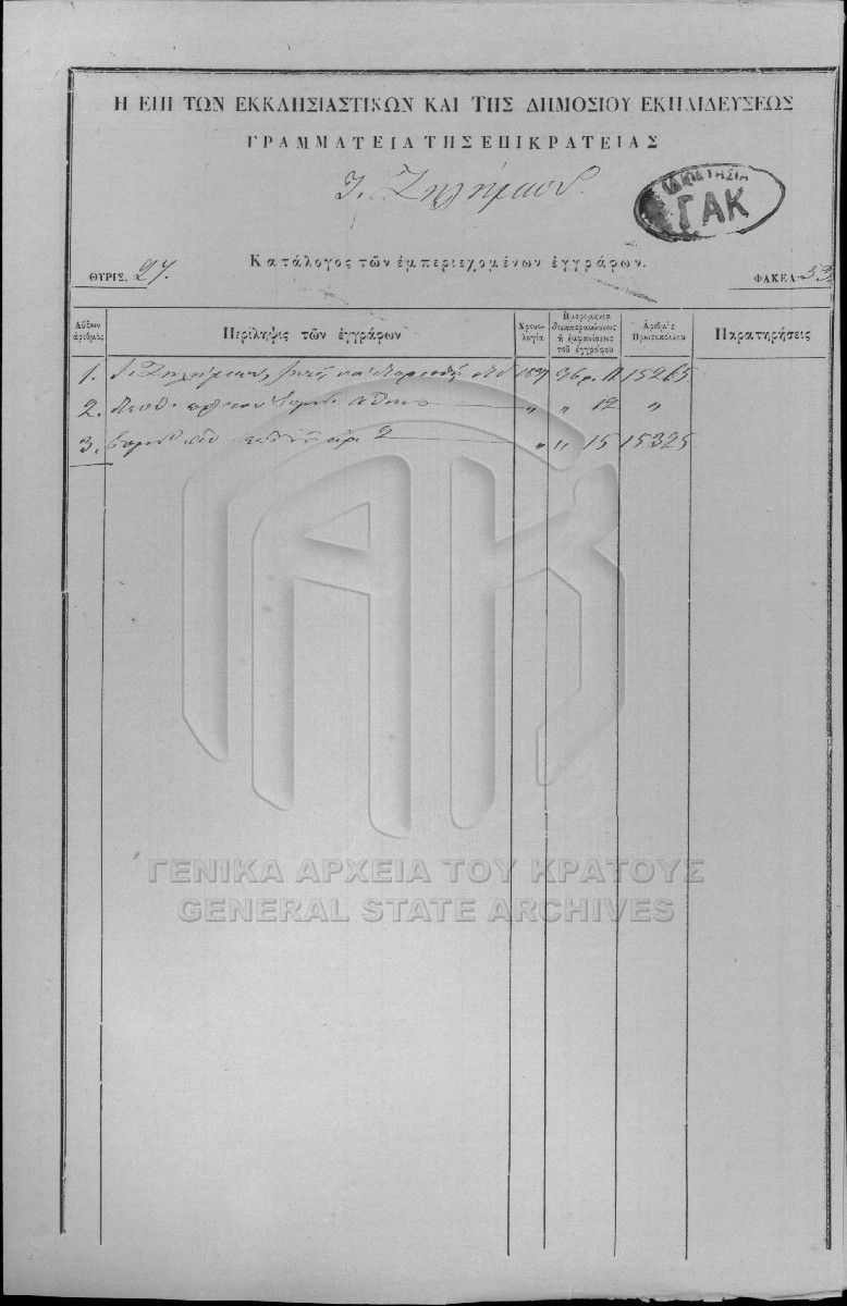 [Fonds] GRGSA-CSA_PAO013 ARCHIVES DE LA CHANCELLERIE/DU MINISTERE DES CULTES ET DE L'EDUCATION PUBLIQUE (1833-1848) - ARCHIVES DE LA CHANCELLERIE/DU MINISTERE DES CULTES ET DE L'EDUCATION PUBLIQUE (1833-1848) [1833 - 1848] Το αρχείο της Γραμματείας επί των Εκκλησιαστικών και της Δημοσίου Εκπαιδεύσεως διαρθρώνεται σε τρεις σειρές ως εξής: Ι. Σειρά των Εκκλη... |