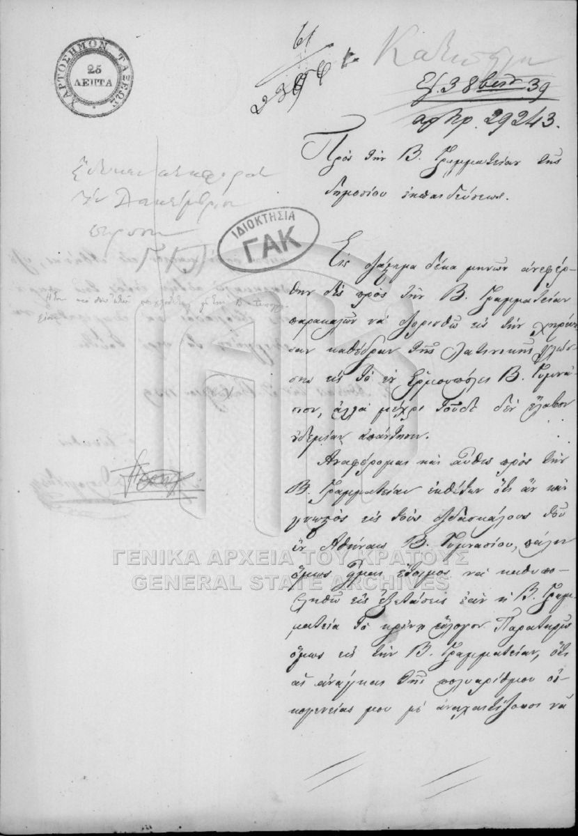 [Fonds] GRGSA-CSA_PAO013 SECRETARIAT/MINISTRY OF ECCLESIASTICAL ISSUES AND STATE EDUCATION ARCHIVE (1833-1848) - SECRETARIAT/MINISTRY OF ECCLESIASTICAL ISSUES AND STATE EDUCATION ARCHIVE (1833-1848) [1833 - 1848] Το αρχείο της Γραμματείας επί των Εκκλησιαστικών και της Δημοσίου Εκπαιδεύσεως διαρθρώνεται σε τρεις σειρές ως εξής: Ι. Σειρά των Εκκλη... |