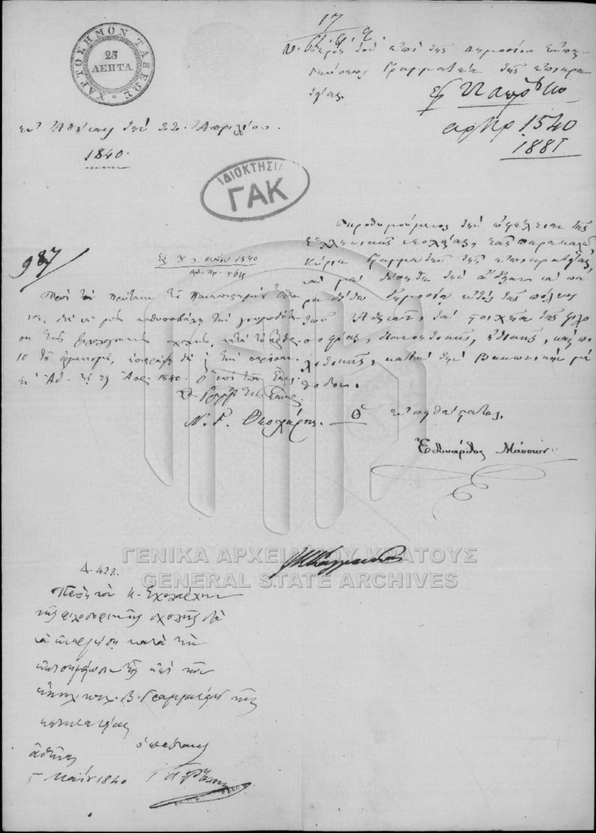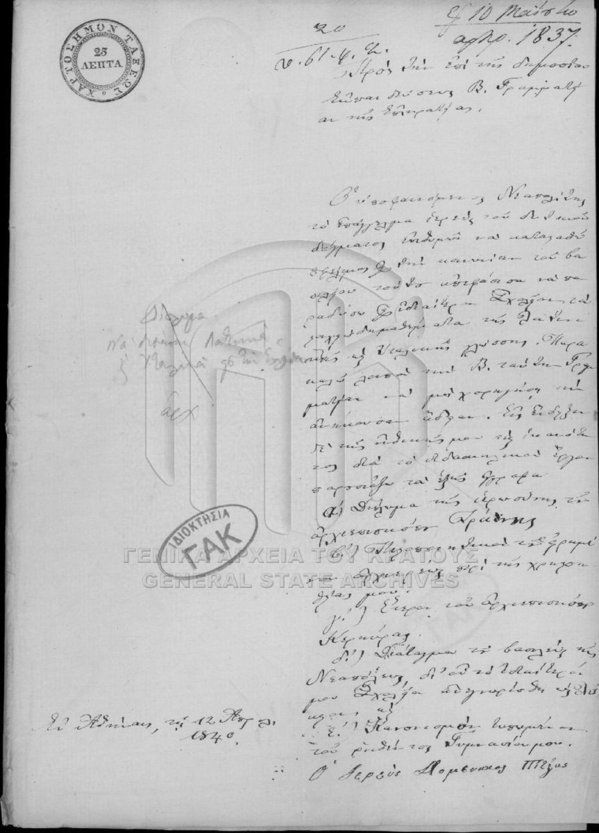 [Fonds] GRGSA-CSA_PAO013 SECRETARIAT/MINISTRY OF ECCLESIASTICAL ISSUES AND STATE EDUCATION ARCHIVE (1833-1848) - SECRETARIAT/MINISTRY OF ECCLESIASTICAL ISSUES AND STATE EDUCATION ARCHIVE (1833-1848) [1833 - 1848] Το αρχείο της Γραμματείας επί των Εκκλησιαστικών και της Δημοσίου Εκπαιδεύσεως διαρθρώνεται σε τρεις σειρές ως εξής: Ι. Σειρά των Εκκλη... |