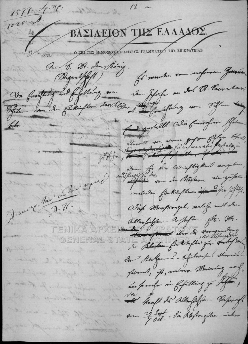 [File] GRGSA-CSA_PAO013.S02.01.F001534 File #1534 - SECRETARIAT/MINISTRY OF ECCLESIASTICAL ISSUES AND STATE EDUCATION ARCHIVE (1833-1848) [1833 - 1834] Education Organization. |
