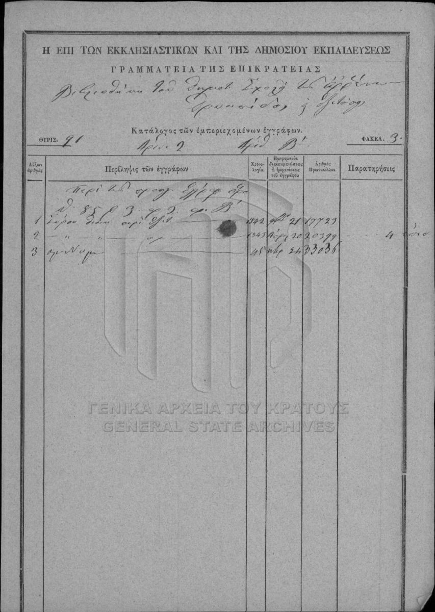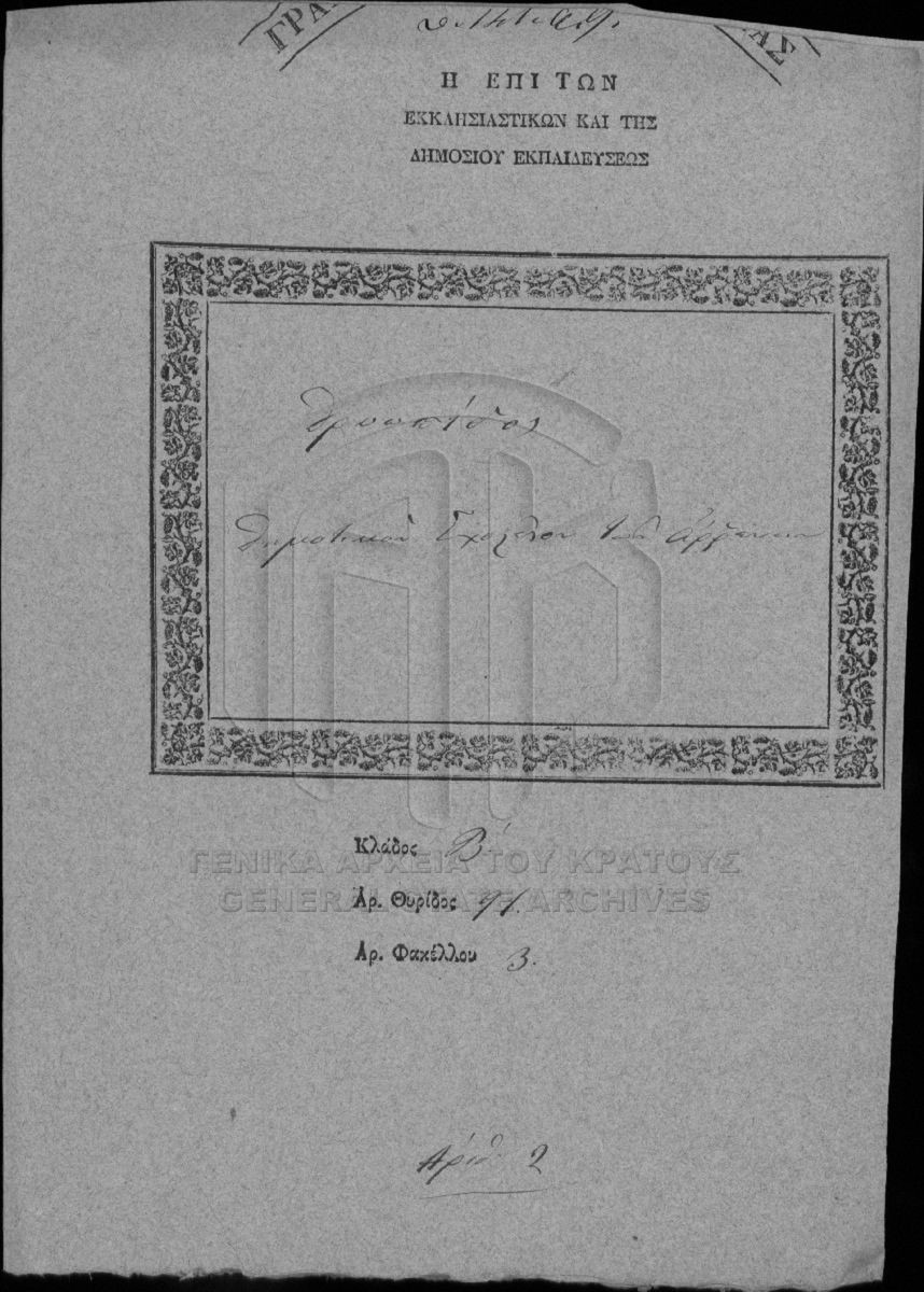 [Fonds] GRGSA-CSA_PAO013 SECRETARIAT/MINISTRY OF ECCLESIASTICAL ISSUES AND STATE EDUCATION ARCHIVE (1833-1848) - SECRETARIAT/MINISTRY OF ECCLESIASTICAL ISSUES AND STATE EDUCATION ARCHIVE (1833-1848) [1833 - 1848] Το αρχείο της Γραμματείας επί των Εκκλησιαστικών και της Δημοσίου Εκπαιδεύσεως διαρθρώνεται σε τρεις σειρές ως εξής: Ι. Σειρά των Εκκλη... |