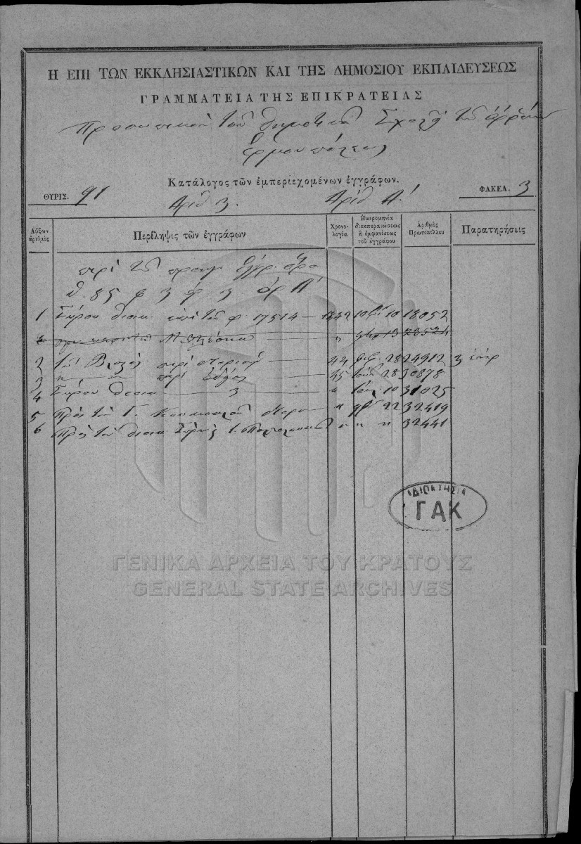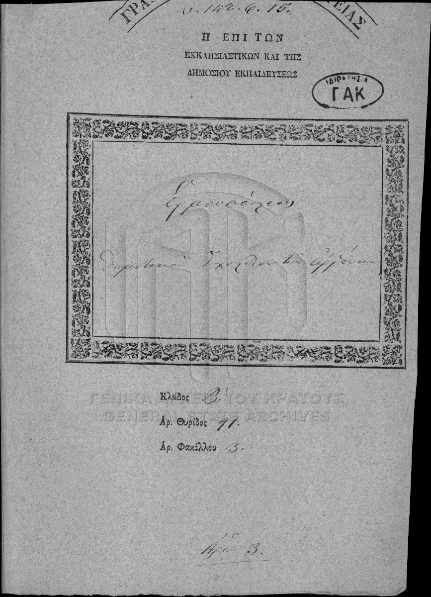 Το αρχείο της Γραμματείας επί των Εκκλησιαστικών και της Δημοσίου Εκπαιδεύσεως διαρθρώνεται σε τρεις σειρές ως εξής: Ι. Σειρά των Εκκλη...