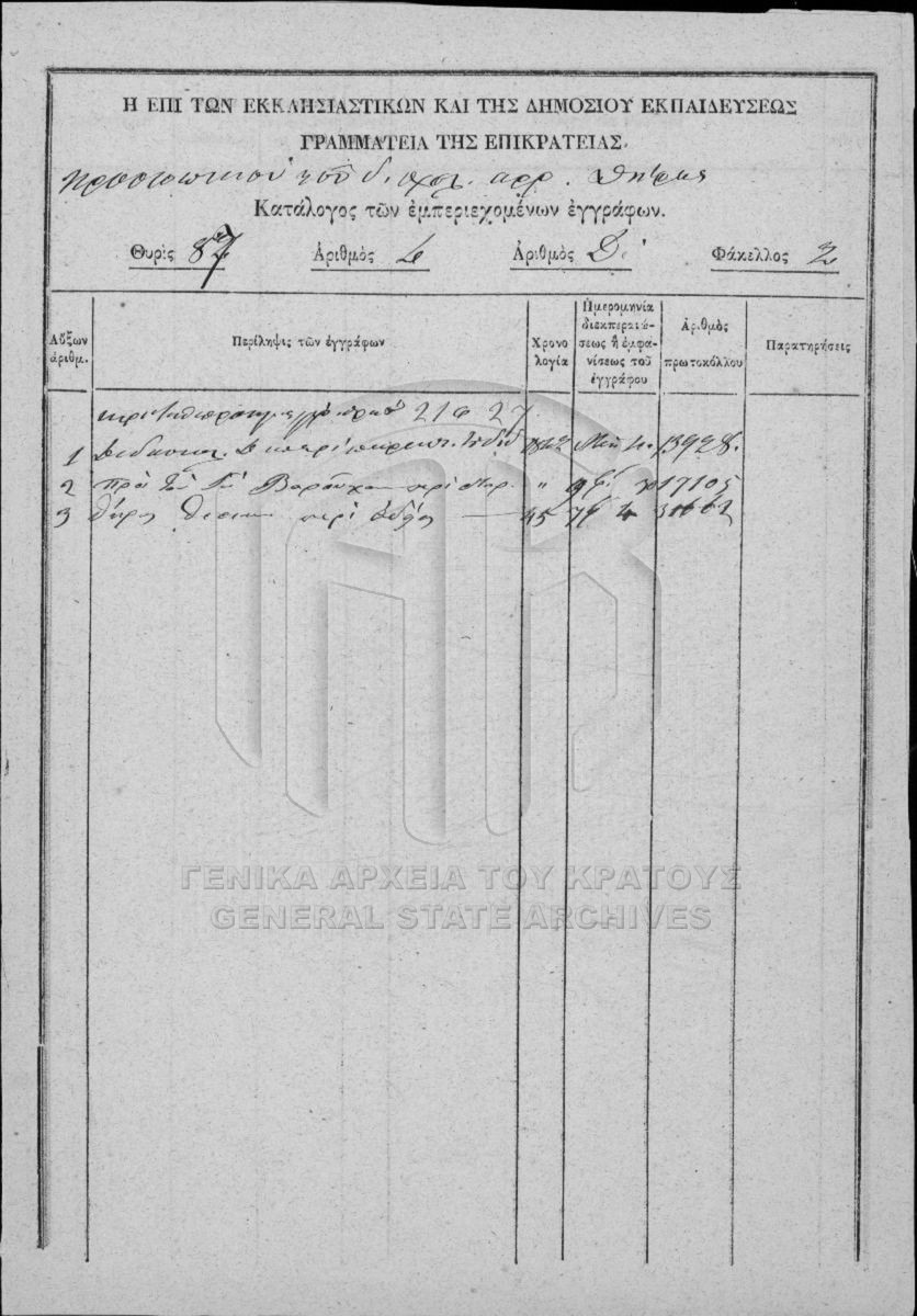 Το αρχείο της Γραμματείας επί των Εκκλησιαστικών και της Δημοσίου Εκπαιδεύσεως διαρθρώνεται σε τρεις σειρές ως εξής: Ι. Σειρά των Εκκλη...