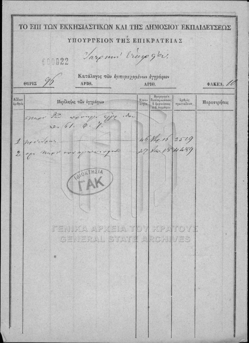 [Fonds] GRGSA-CSA_PAO013 SECRETARIAT/MINISTRY OF ECCLESIASTICAL ISSUES AND STATE EDUCATION ARCHIVE (1833-1848) - SECRETARIAT/MINISTRY OF ECCLESIASTICAL ISSUES AND STATE EDUCATION ARCHIVE (1833-1848) [1833 - 1848] Το αρχείο της Γραμματείας επί των Εκκλησιαστικών και της Δημοσίου Εκπαιδεύσεως διαρθρώνεται σε τρεις σειρές ως εξής: Ι. Σειρά των Εκκλη... |