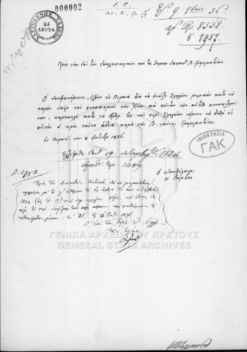 [File] GRGSA-CSA_PAO013.S02.01.F001734 File #1734 - SECRETARIAT/MINISTRY OF ECCLESIASTICAL ISSUES AND STATE EDUCATION ARCHIVE (1833-1848) [1836] Vamva, Private Greek School in Piraeus. |