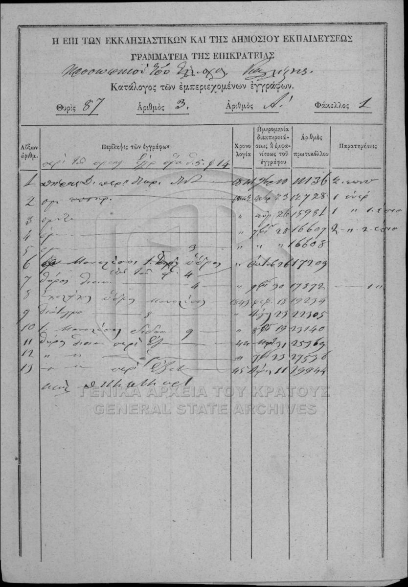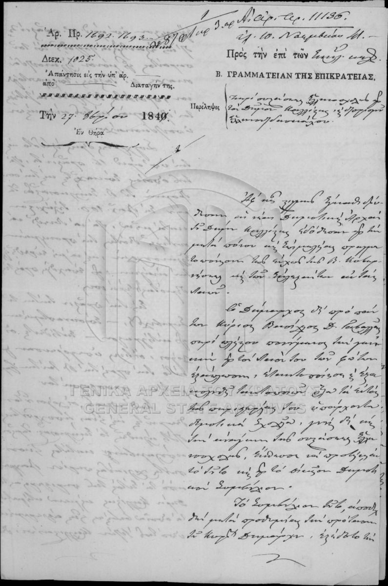 [Fonds] GRGSA-CSA_PAO013 SECRETARIAT/MINISTRY OF ECCLESIASTICAL ISSUES AND STATE EDUCATION ARCHIVE (1833-1848) - SECRETARIAT/MINISTRY OF ECCLESIASTICAL ISSUES AND STATE EDUCATION ARCHIVE (1833-1848) [1833 - 1848] Το αρχείο της Γραμματείας επί των Εκκλησιαστικών και της Δημοσίου Εκπαιδεύσεως διαρθρώνεται σε τρεις σειρές ως εξής: Ι. Σειρά των Εκκλη...  |