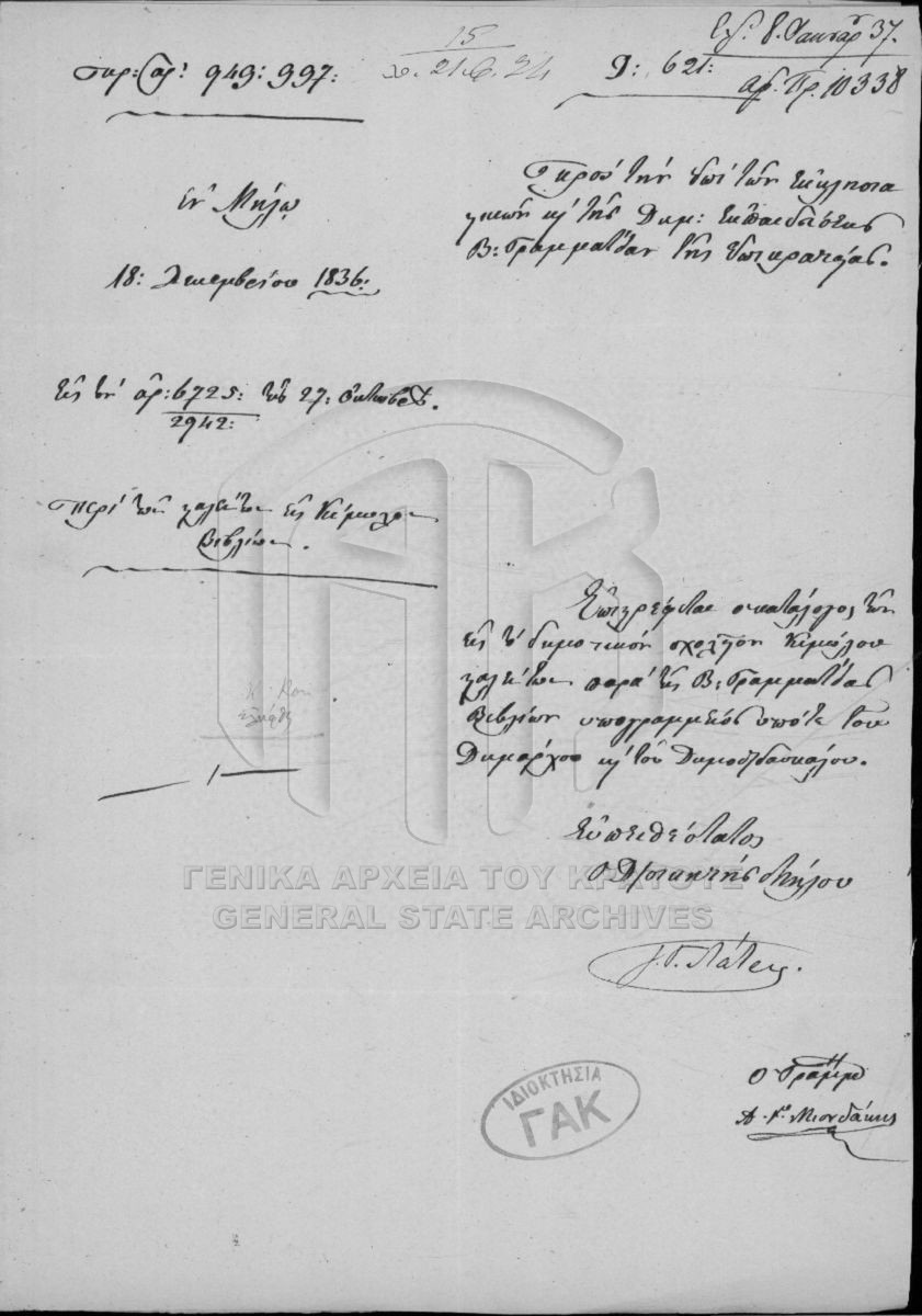 [File] GRGSA-CSA_PAO013.S02.01.F001890 File #1890 - SECRETARIAT/MINISTRY OF ECCLESIASTICAL ISSUES AND STATE EDUCATION ARCHIVE (1833-1848) [1835 - 1839] Kimolos elementary school. |