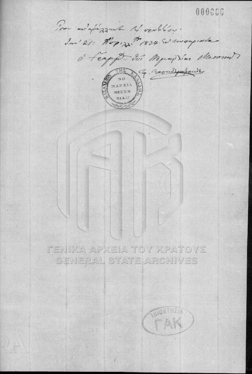 [File] GRGSA-CSA_PAO013.S02.01.F002104 File #2104 - SECRETARIAT/MINISTRY OF ECCLESIASTICAL ISSUES AND STATE EDUCATION ARCHIVE (1833-1848) [1834 - 1835] Ligoudista elementary school as in Trifylia. |