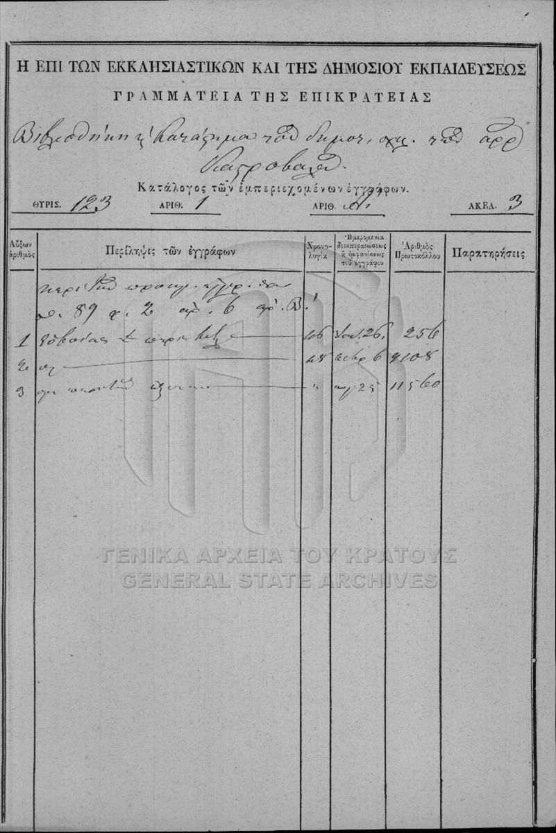 [Fonds] GRGSA-CSA_PAO013 SECRETARIAT/MINISTRY OF ECCLESIASTICAL ISSUES AND STATE EDUCATION ARCHIVE (1833-1848) - SECRETARIAT/MINISTRY OF ECCLESIASTICAL ISSUES AND STATE EDUCATION ARCHIVE (1833-1848) [1833 - 1848] Το αρχείο της Γραμματείας επί των Εκκλησιαστικών και της Δημοσίου Εκπαιδεύσεως διαρθρώνεται σε τρεις σειρές ως εξής: Ι. Σειρά των Εκκλη... |