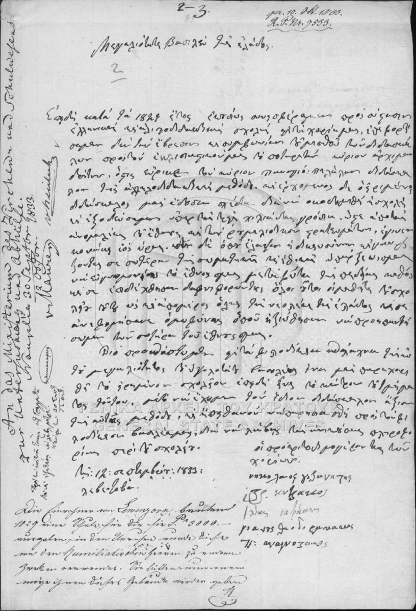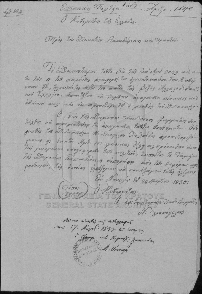 [File] GRGSA-CSA_PAO013.S02.01.F001956 File #1956 - SECRETARIAT/MINISTRY OF ECCLESIASTICAL ISSUES AND STATE EDUCATION ARCHIVE (1833-1848) [1833 – 1834] Levetzova School as in Sparti. |