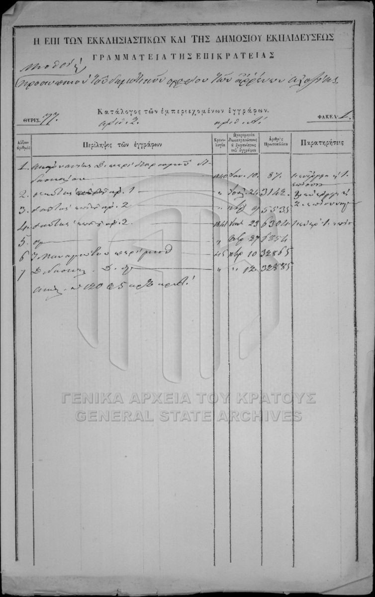 [Fonds] GRGSA-CSA_PAO013 SECRETARIAT/MINISTRY OF ECCLESIASTICAL ISSUES AND STATE EDUCATION ARCHIVE (1833-1848) - SECRETARIAT/MINISTRY OF ECCLESIASTICAL ISSUES AND STATE EDUCATION ARCHIVE (1833-1848) [1833 - 1848] Το αρχείο της Γραμματείας επί των Εκκλησιαστικών και της Δημοσίου Εκπαιδεύσεως διαρθρώνεται σε τρεις σειρές ως εξής: Ι. Σειρά των Εκκλη... |