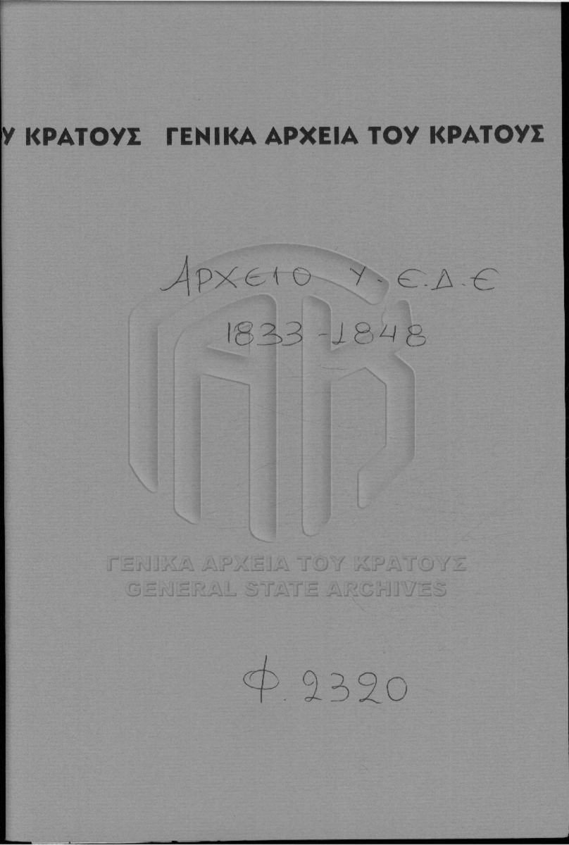 [Fonds] GRGSA-CSA_PAO013 SECRETARIAT/MINISTRY OF ECCLESIASTICAL ISSUES AND STATE EDUCATION ARCHIVE (1833-1848) - SECRETARIAT/MINISTRY OF ECCLESIASTICAL ISSUES AND STATE EDUCATION ARCHIVE (1833-1848) [1833 - 1848] Το αρχείο της Γραμματείας επί των Εκκλησιαστικών και της Δημοσίου Εκπαιδεύσεως διαρθρώνεται σε τρεις σειρές ως εξής: Ι. Σειρά των Εκκλη... |