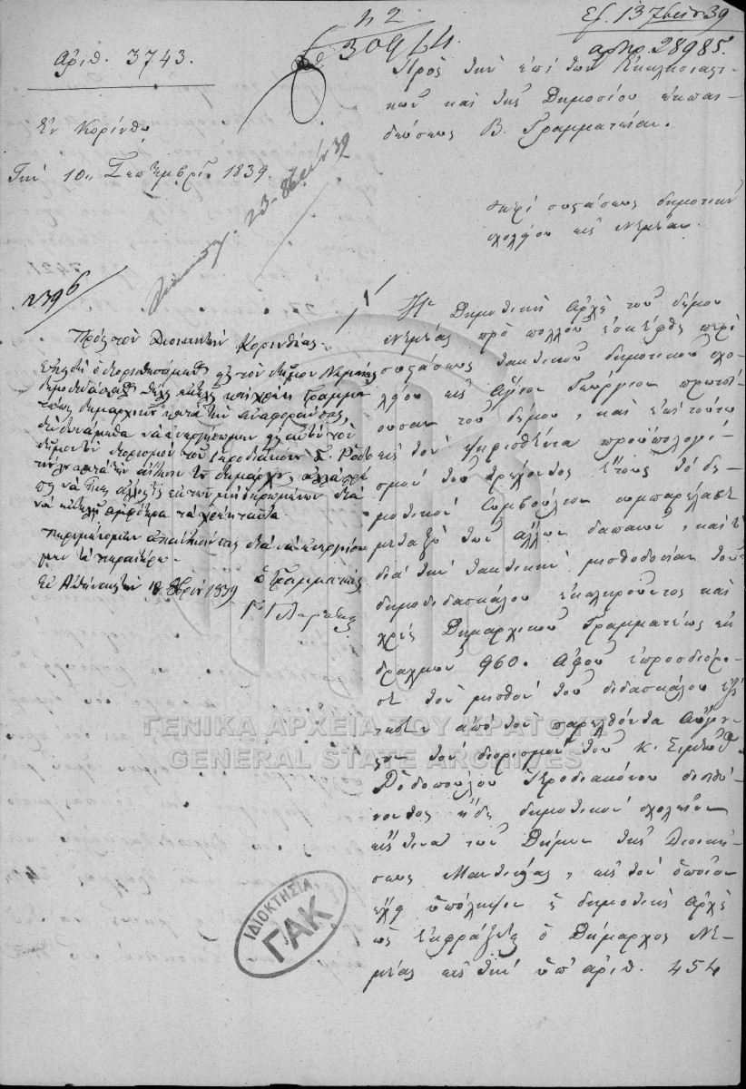 [Fichier] GRGSA-CSA_PAO013.S02.01.F002341 Fichier #2341 - ARCHIVES DE LA CHANCELLERIE/DU MINISTERE DES CULTES ET DE L'EDUCATION PUBLIQUE (1833-1848) [1839] École primaire de Némée |