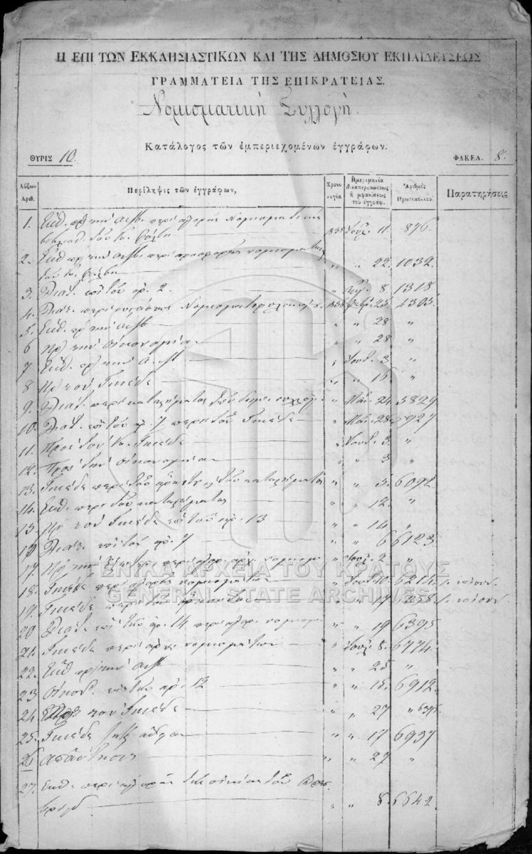 Το αρχείο της Γραμματείας επί των Εκκλησιαστικών και της Δημοσίου Εκπαιδεύσεως διαρθρώνεται σε τρεις σειρές ως εξής: Ι. Σειρά των Εκκλη...