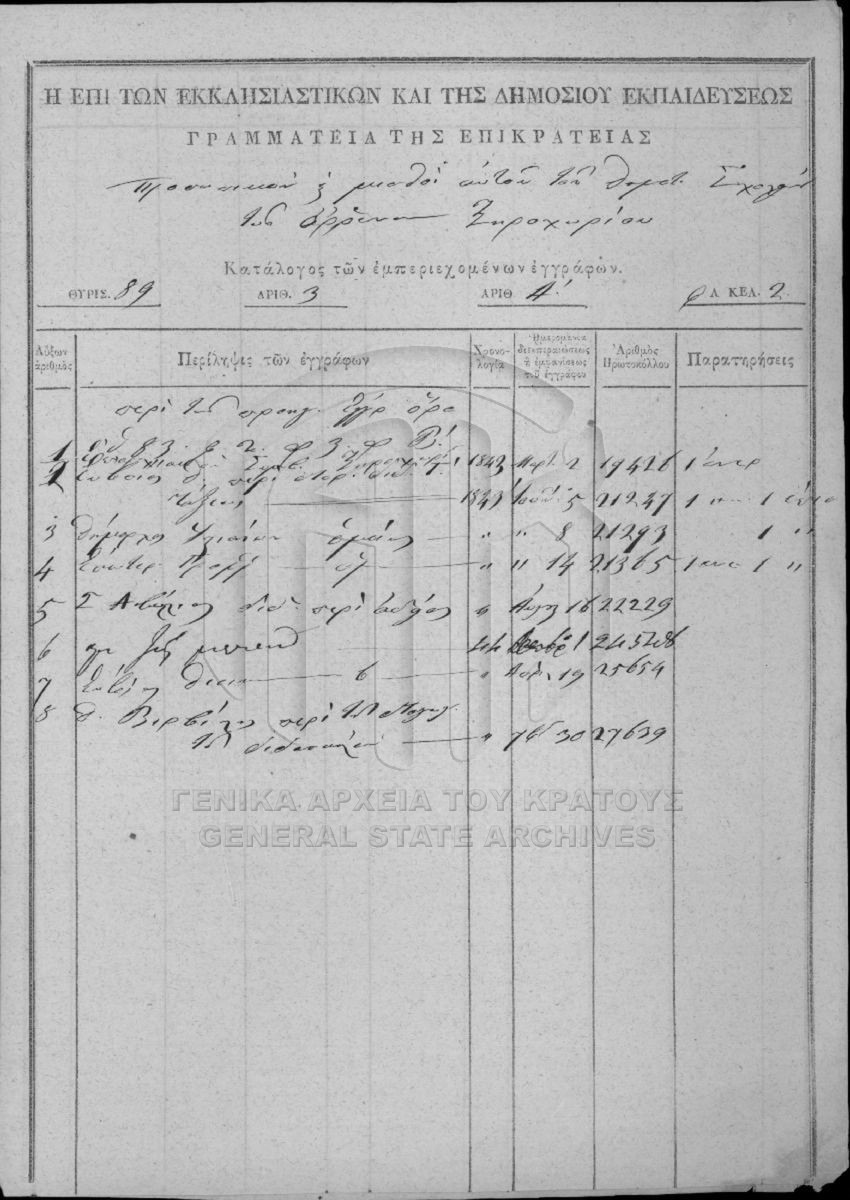 Το αρχείο της Γραμματείας επί των Εκκλησιαστικών και της Δημοσίου Εκπαιδεύσεως διαρθρώνεται σε τρεις σειρές ως εξής: Ι. Σειρά των Εκκλη...