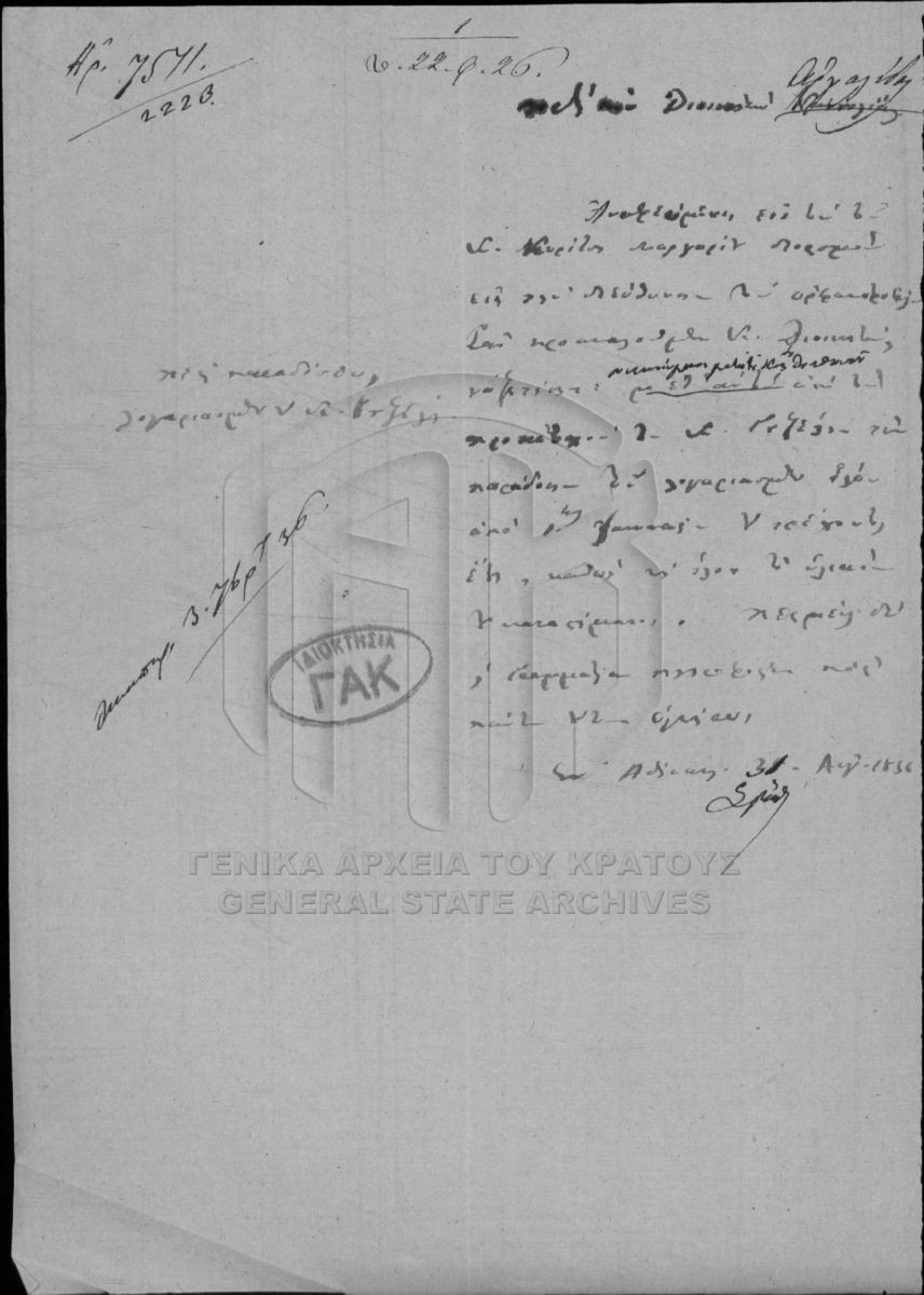 [File] GRGSA-CSA_PAO013.S02.01.F002411 File #2411 - SECRETARIAT/MINISTRY OF ECCLESIASTICAL ISSUES AND STATE EDUCATION ARCHIVE (1833-1848) [1836 - 1838] Debt of Gouzelis to the Orphanage. |