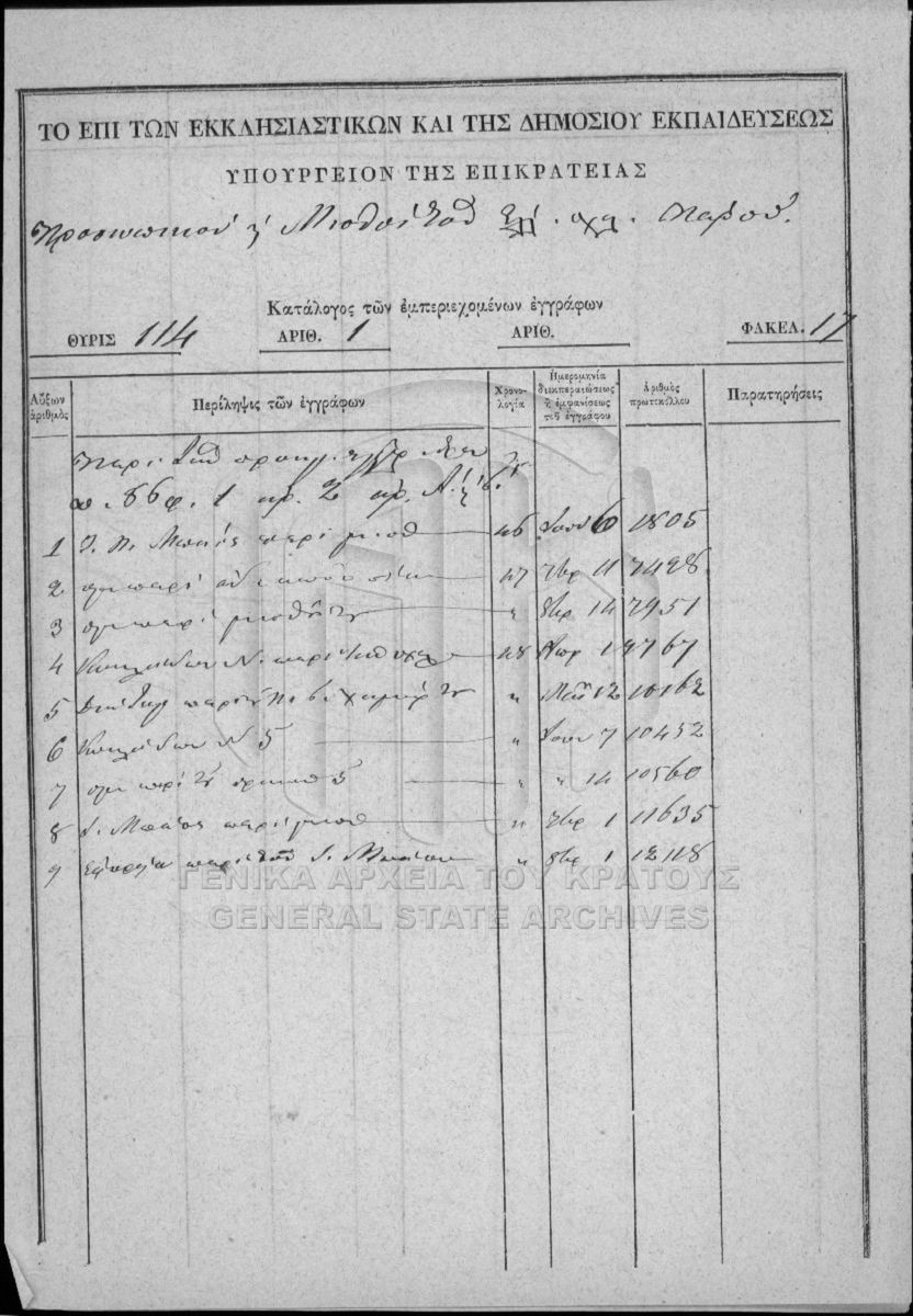 [Fonds] GRGSA-CSA_PAO013 SECRETARIAT/MINISTRY OF ECCLESIASTICAL ISSUES AND STATE EDUCATION ARCHIVE (1833-1848) - SECRETARIAT/MINISTRY OF ECCLESIASTICAL ISSUES AND STATE EDUCATION ARCHIVE (1833-1848) [1833 - 1848] Το αρχείο της Γραμματείας επί των Εκκλησιαστικών και της Δημοσίου Εκπαιδεύσεως διαρθρώνεται σε τρεις σειρές ως εξής: Ι. Σειρά των Εκκλη... |