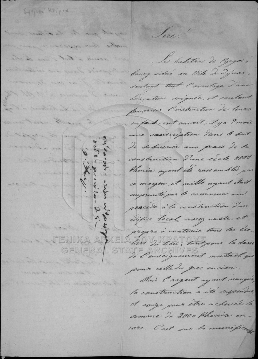 [File] GRGSA-CSA_PAO013.S02.01.F002631 File #2631 - SECRETARIAT/MINISTRY OF ECCLESIASTICAL ISSUES AND STATE EDUCATION ARCHIVE (1833-1848) [1839] Municipal School of Pyrgos, in Tinos. |