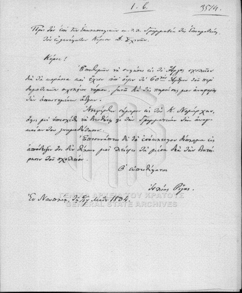 [Φάκελος] GRGSA-CSA_PAO013.S02.01.F002641 Φάκελος #2641 - Ηλίας Ρήγα (Αμερικανός). (Περί συστάσεως σχολείου Κορασίων εις Άργος) [1834] |
