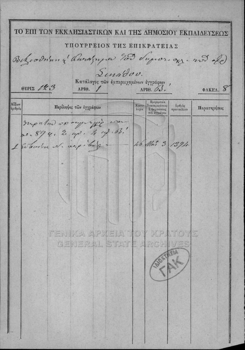 Το αρχείο της Γραμματείας επί των Εκκλησιαστικών και της Δημοσίου Εκπαιδεύσεως διαρθρώνεται σε τρεις σειρές ως εξής: Ι. Σειρά των Εκκλη...