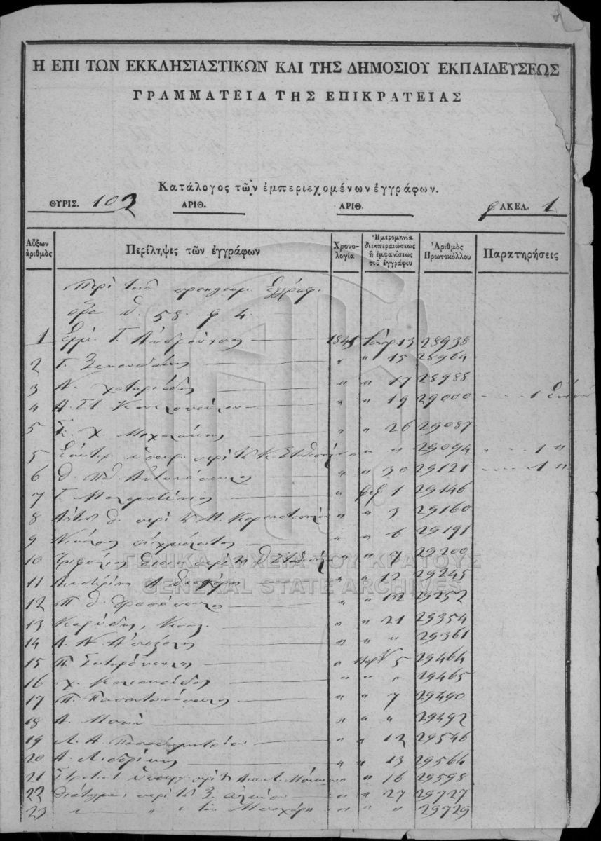 [Fonds] GRGSA-CSA_PAO013 SECRETARIAT/MINISTRY OF ECCLESIASTICAL ISSUES AND STATE EDUCATION ARCHIVE (1833-1848) - SECRETARIAT/MINISTRY OF ECCLESIASTICAL ISSUES AND STATE EDUCATION ARCHIVE (1833-1848) [1833 - 1848] Το αρχείο της Γραμματείας επί των Εκκλησιαστικών και της Δημοσίου Εκπαιδεύσεως διαρθρώνεται σε τρεις σειρές ως εξής: Ι. Σειρά των Εκκλη... |