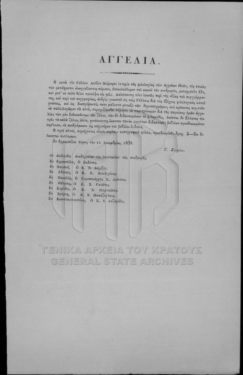 Abonnements du gouvernement à des publications d’écrits. [«Annonce» de G. Sourias jointe au doc. no. 5 (15 exemplaires) pour la publicati...