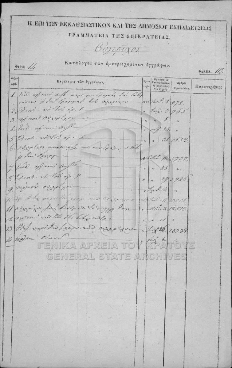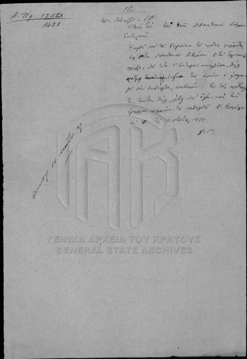 [Fonds] GRGSA-CSA_PAO013 ARCHIVES DE LA CHANCELLERIE/DU MINISTERE DES CULTES ET DE L'EDUCATION PUBLIQUE (1833-1848) - ARCHIVES DE LA CHANCELLERIE/DU MINISTERE DES CULTES ET DE L'EDUCATION PUBLIQUE (1833-1848) [1833 - 1848] Το αρχείο της Γραμματείας επί των Εκκλησιαστικών και της Δημοσίου Εκπαιδεύσεως διαρθρώνεται σε τρεις σειρές ως εξής: Ι. Σειρά των Εκκλη... |