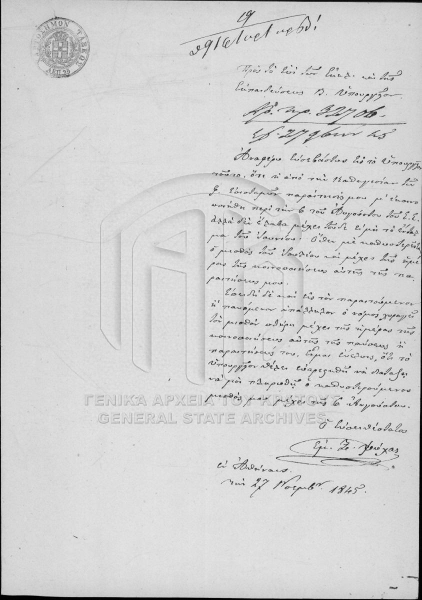 Gymnasium of Syros. A. Staff, B. Staff payroll, C. Bursars, D. Their payroll, E. Exams and List of Students, F. Library and instruments.