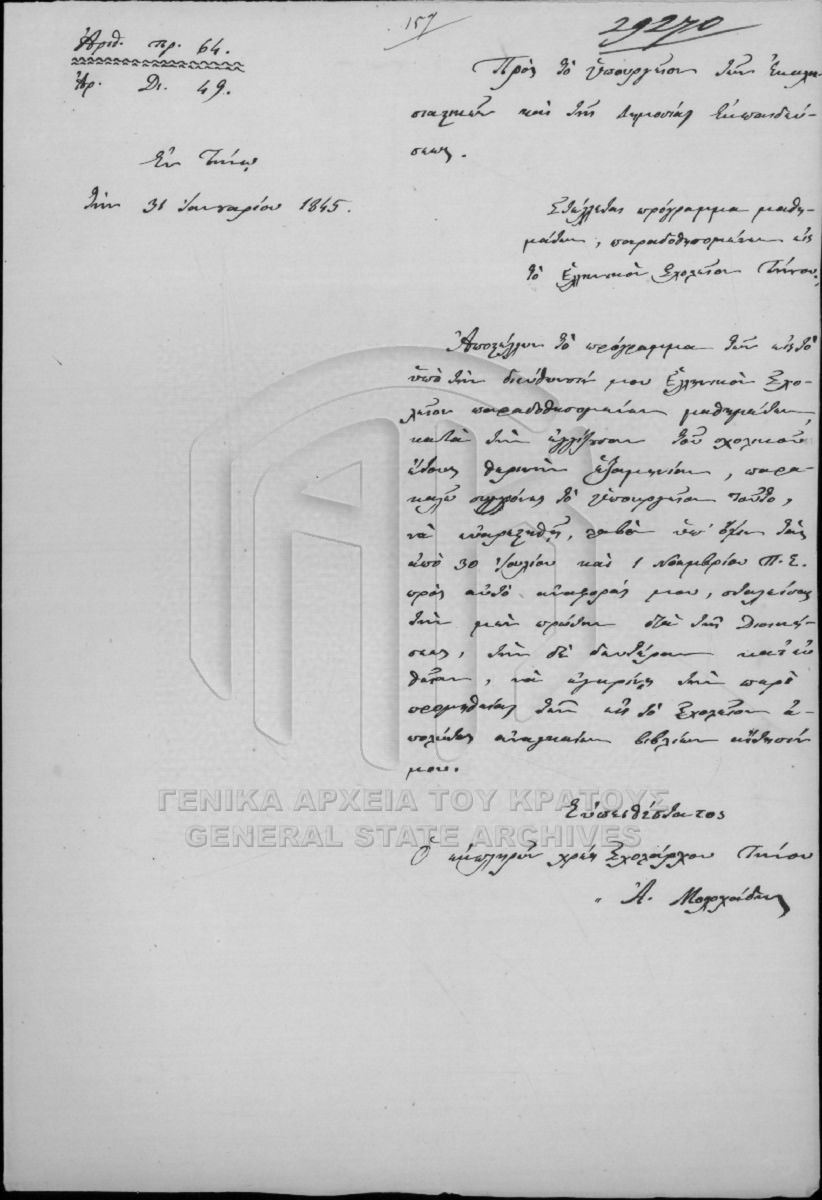 Greek School of Tinos. Staff payroll. Library and Exams. Staff. List of students.