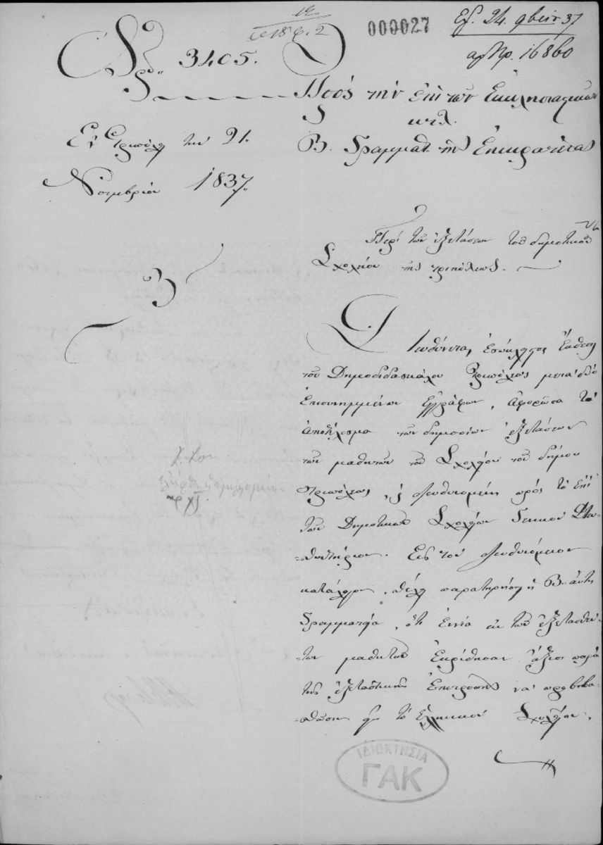 Φάκελος #3024 - Τριπόλεως δημοτικόν Σχολείον  [1835 - 1839]