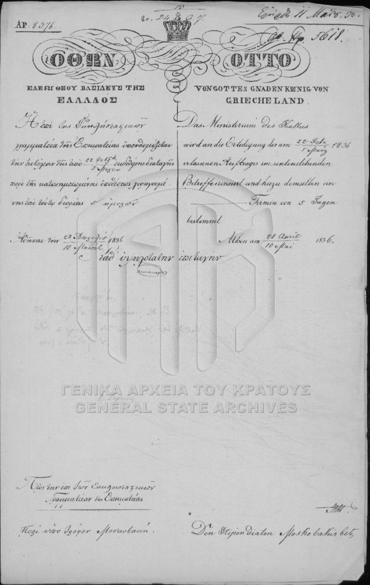 [File] GRGSA-CSA_PAO013.S02.01.F003119 File #3119 - SECRETARIAT/MINISTRY OF ECCLESIASTICAL ISSUES AND STATE EDUCATION ARCHIVE (1833-1848) [1835 - 1839] Ioannidis and Moschovakis. |