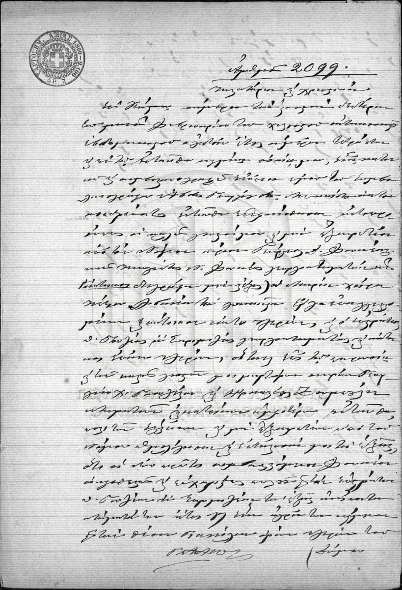 [Pièce] GRGSA-MES_NOT128.01.F000036.IT002099 Pièce #2099 - ΣΥΜΒΟΛΑΙΟΓΡΑΦΙΚΟ ΑΡΧΕΙΟ ΑΒΙΑΣ [22 Φεβρουαρίου 1878] Συμβολαιογραφική πράξη. Πωλητήριον και χρεωστικόν. |