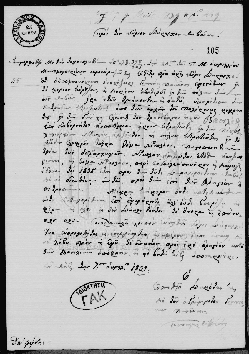 [Item] GRGSA-CSA_PAO007.00.01.F000020.IT000105 Item #105 - Aτομική αίτηση απονομής [7 Απριλίου 1839] Αίτηση αριστείου του Γιαννάκη Πανούση προς το δήμαρχο Θηβαίων.  |