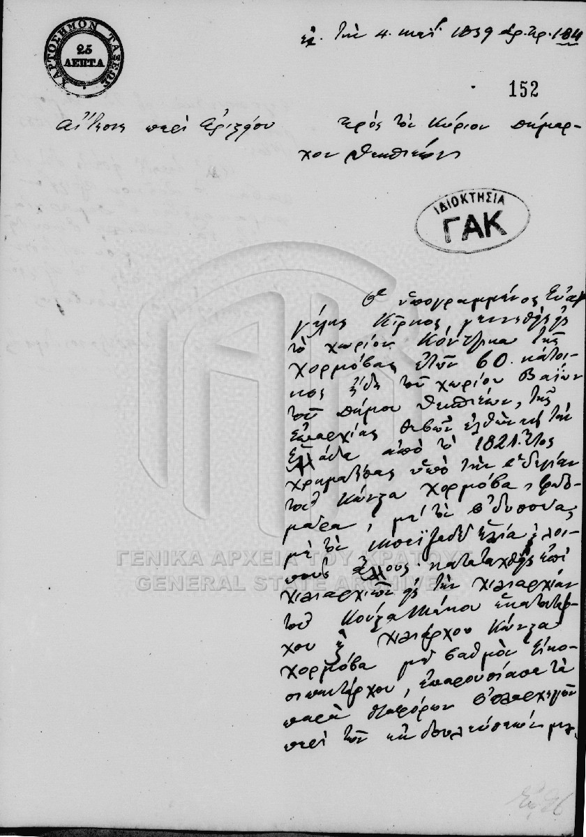 [Item] GRGSA-CSA_PAO007.00.01.F000020.IT000152 Item #152 - Aτομική αίτηση απονομής [4 Μαΐου 1839] Αίτηση αριστείου του Βαγγέλη Κίρκου κάτοικου του χωριού Βάια προς το δήμαρχο Θεσπιέων. |