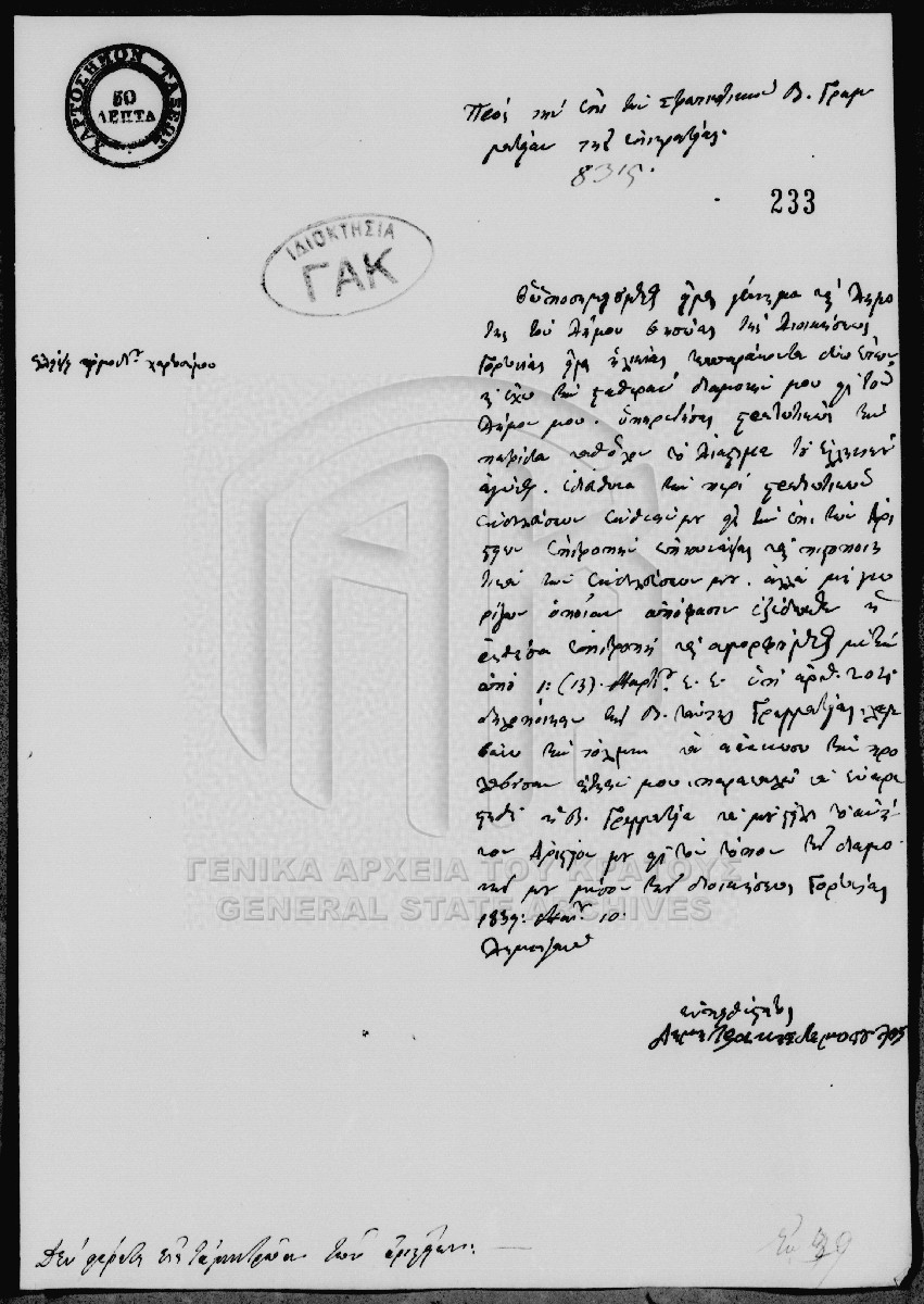 [Fonds] GRGSA-CSA_PAO007.00 Archive of Honorary Awards - Archive of Honorary Awards [1834 - 1865] Το αρχείο αποτελείται από 307 φακέλους ποικίλου όγκου, οι οποίοι φέρουν ταξινομική αρίθμηση κατά χρονολογική σειρά, από 1-307. Αθροιστικά...  |