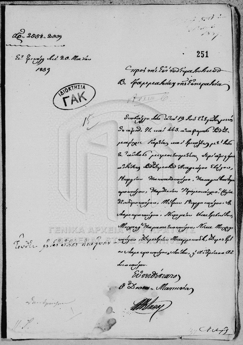 [Pièce] GRGSA-CSA_PAO007.00.01.F000020.IT000251 Pièce #251 - Υπηρεσιακή αλληλογραφία [20 Μαΐου 1839] Επιστολή του Διοικητή Μαντίνειας προς τη Γραμματεία των Στρατιωτικών για να διαβιβαστούν αιτήσεις αριστείου κατοίκων της περιοχής.  |