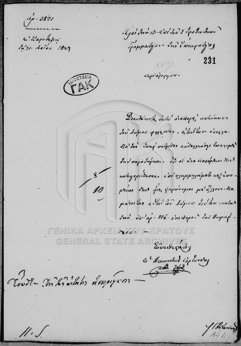 [Item] GRGSA-CSA_PAO007.00.01.F000022.IT000231 Item #231 - Υπηρεσιακή αλληλογραφία [31 Μαΐου 1839] Ο διοικητής Γορτυνίας διαβιβάζει προς την Επί των Στρατιωτικών Γραμματεία τις αναφορές για αριστείο 8 κατοίκων του Δήμου Φαλαισίας ώστε ν... |