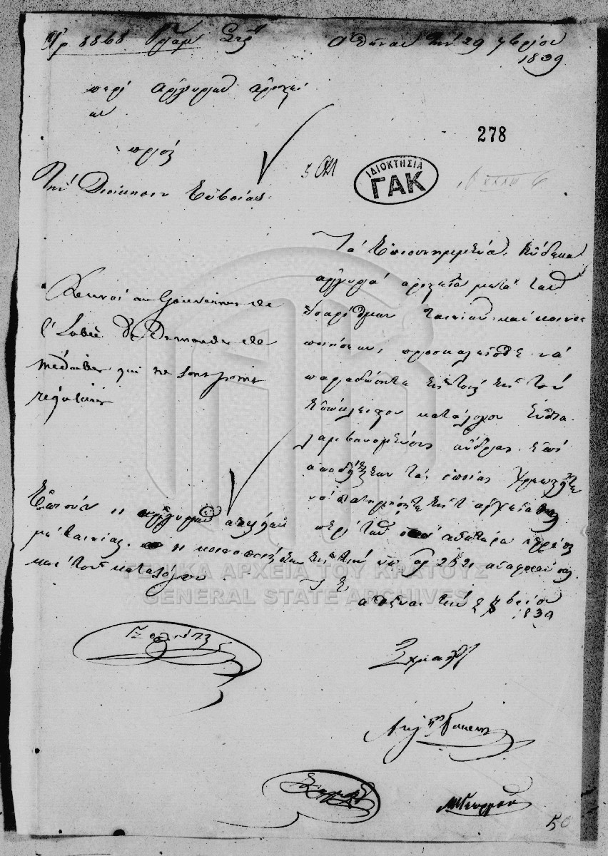 [Item] GRGSA-CSA_PAO007.00.01.F000022.IT000278 Item #278 - Υπηρεσιακή αλληλογραφία [2 Οκτωβρίου 1839] Η Γραμματεία των Στρατιωτικών διαβιβάζει προς τη Διοίκηση Ευβοίας 11 αργυρά αριστεία με τις ταινίες και τα διπλώματα τους προκειμένου να ... |