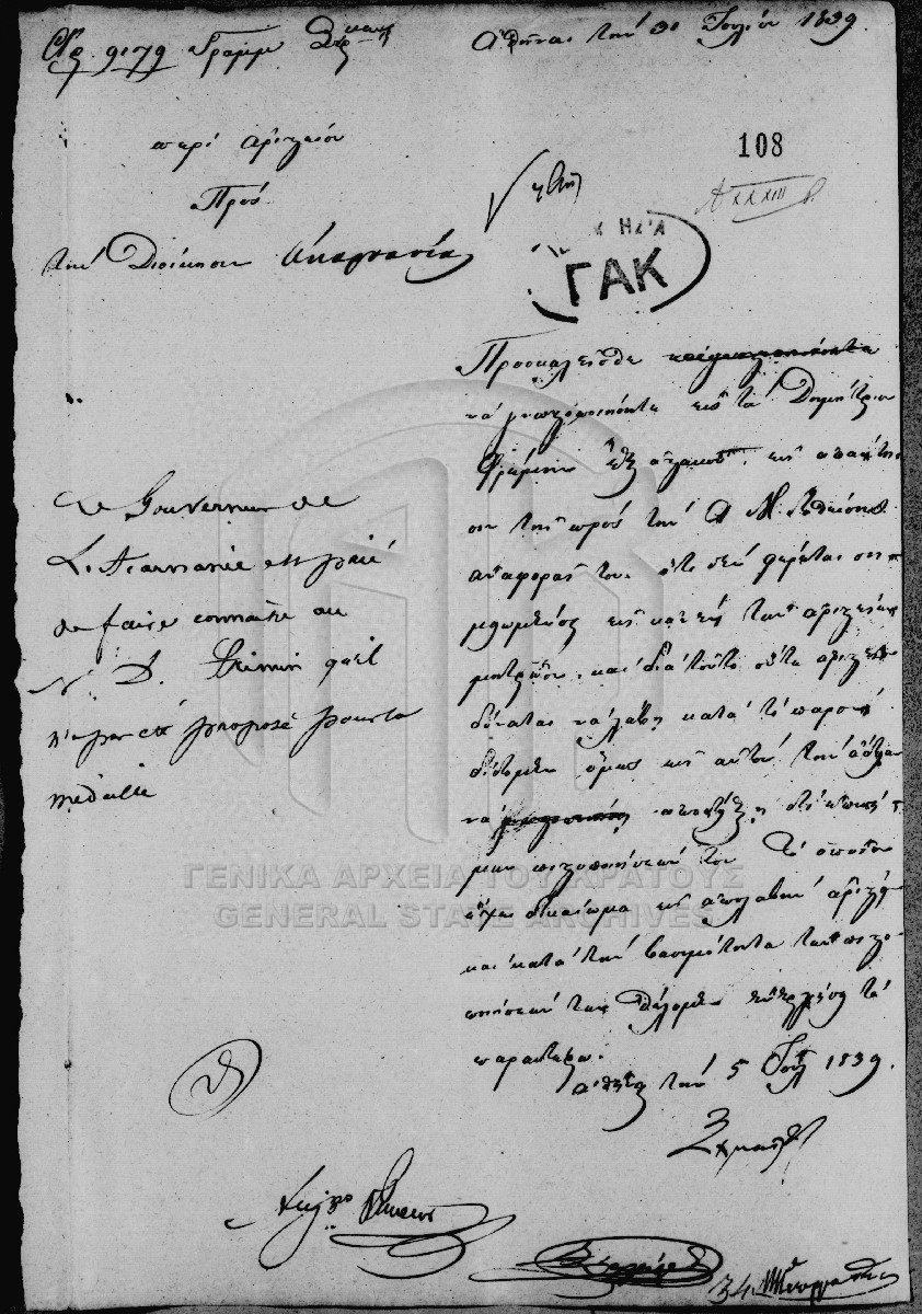 [Τεκμήριο] GRGSA-CSA_PAO007.00.01.F000023.IT000108 Τεκμήριο #108 - Υπηρεσιακή αλληλογραφία [31 Ιουλίου 1839] Έγγραφο της Γραμματείας των Στρατιωτικών προς τη Διοίκηση Ακαρνανίας, προκειμένου να γνωστοποιηθεί στον Δημήτρη Φρέμη από τον Αστακό ότι ... |