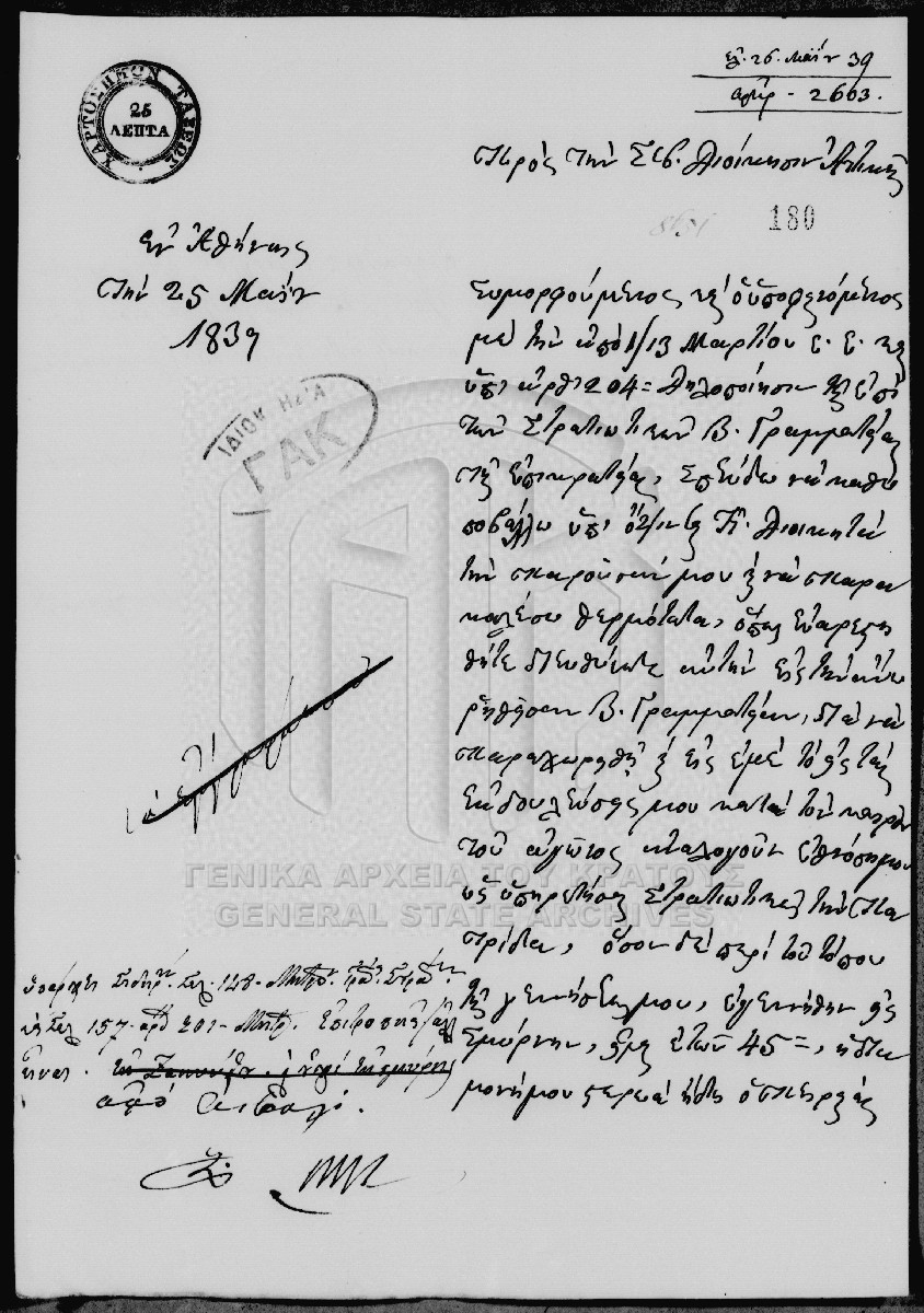 [Item] GRGSA-CSA_PAO007.00.01.F000023.IT000180 Item #180 - Aτομική αίτηση απονομής [25 Μαΐου 1839] Αίτηση του Γεώργιου Περλουρέντζου από την Σμύρνη προς το Δήμαρχο Αθηνών, προκειμένου να του απονεμηθεί αριστείο για τη συμμετοχή του στον... |