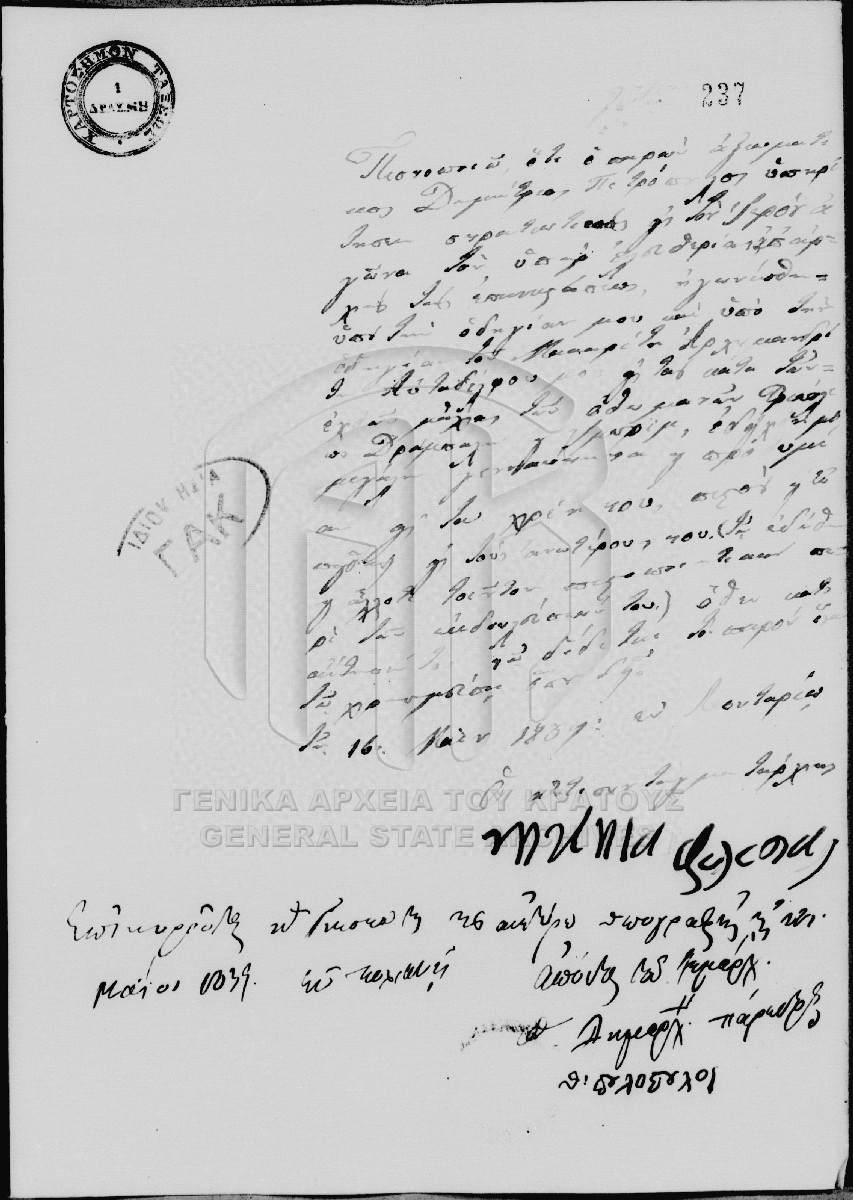 [Τεκμήριο] GRGSA-CSA_PAO007.00.01.F000023.IT000237 Τεκμήριο #237 - Πιστοποιητικά [16 Μαΐου 1839] 'Εγγραφο με το οποίο πιστοποιείται η συμμετοχή του Δημήτρη Πετρόπουλου, από το χωριό Τουρμολέκα Μεγαλοπόλεως, στον Αγώνα υπέρ της Ανεξαρτ... |