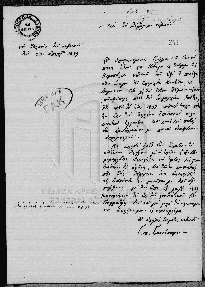 [Τεκμήριο] GRGSA-CSA_PAO007.00.01.F000023.IT000251 Τεκμήριο #251 - Aτομική αίτηση απονομής [27 Απριλίου 1839] Αίτηση του Γεώργιου Γιαννόπουλου προς το Δήμαρχο Νεζερών, προκειμένου να του απονεμηθεί αριστείο για τη συμμετοχή του στον Αγώνα υπέρ της... |