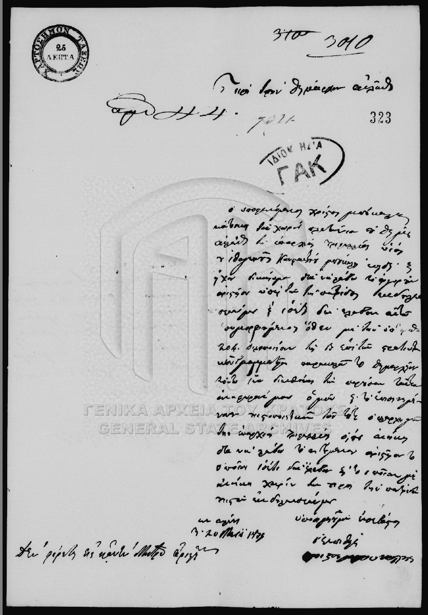 [Item] GRGSA-CSA_PAO007.00.01.F000023.IT000323 Item #323 - Aτομική αίτηση απονομής [20 Μαΐου 1839] Αίτηση του Χρήστου Μπούκαλη από το χωριό Πλατάνια προς το δήμαρχο Αυλώνος προκειμένου να του απονεμηθεί αριστείο για τη συμμετοχή του στο... |