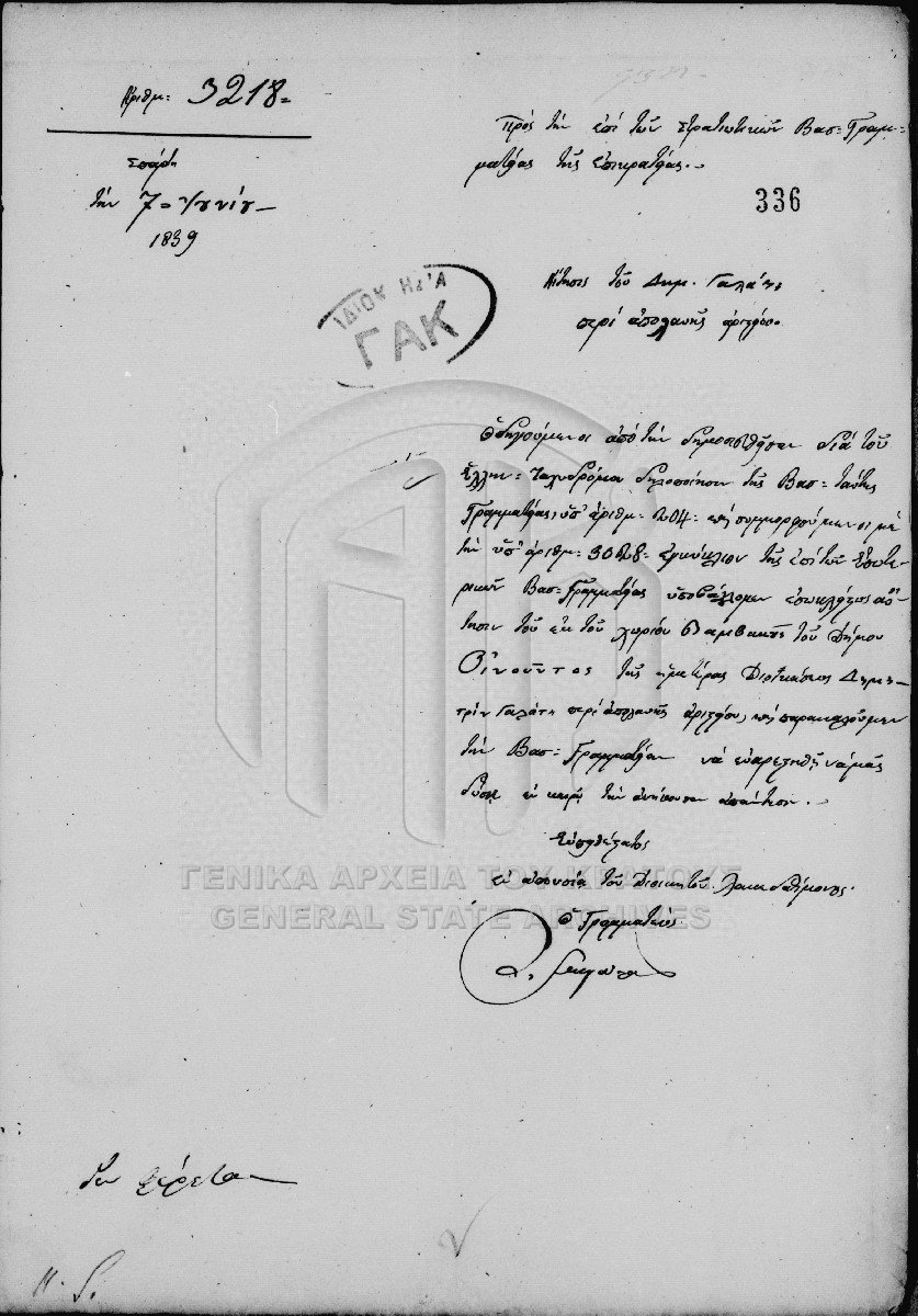 [Τεκμήριο] GRGSA-CSA_PAO007.00.01.F000023.IT000336 Τεκμήριο #336 - Υπηρεσιακή αλληλογραφία [7 Ιουνίου 1839] Έγγραφο που αποστέλλεται από τη Διοίκηση Λακεδαίμονος προς τη Γραμματεία των Στρατιωτικών προκειμένου να διαβιβαστεί η αίτηση απονομής αρ... |