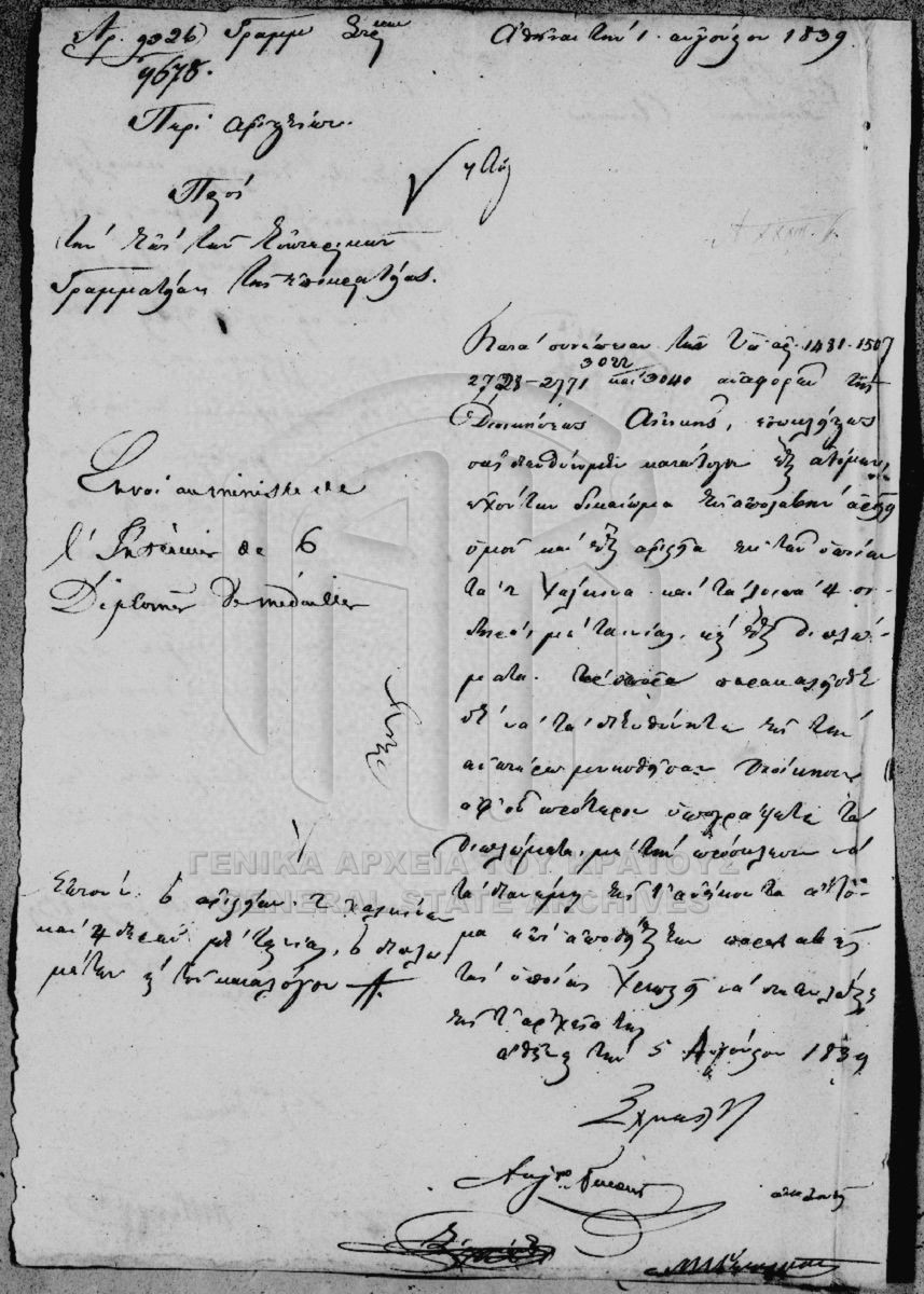 [Item] GRGSA-CSA_PAO007.00.01.F000023.IT000376 Item #376 - Υπηρεσιακή αλληλογραφία [1 Αυγούστου 1839] Έγγραφο της Γραμματείας των Στρατιωτικών προς τη Γραμματεία των Εσωτερικών, προκειμένου να διαβιβαστούν για έγκριση δύο χάλκινα και τέσσε... |